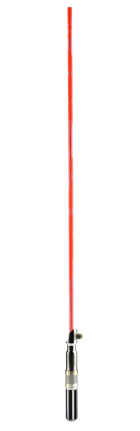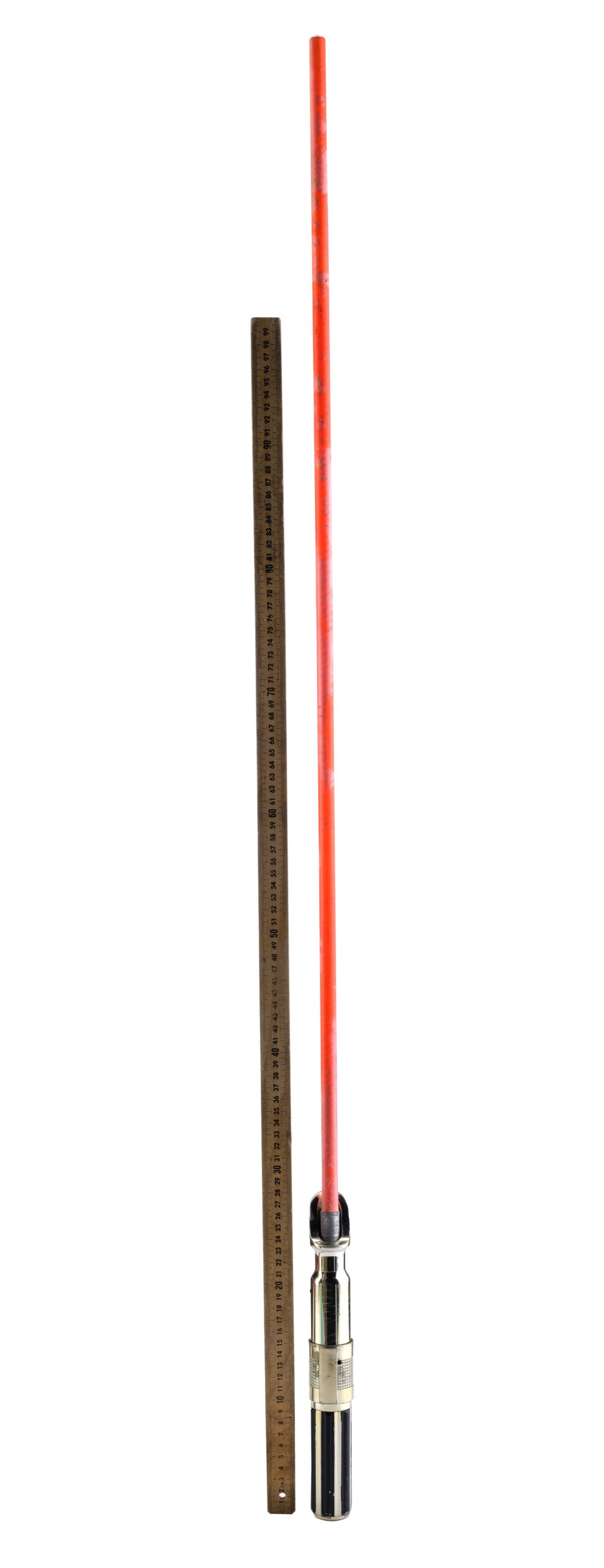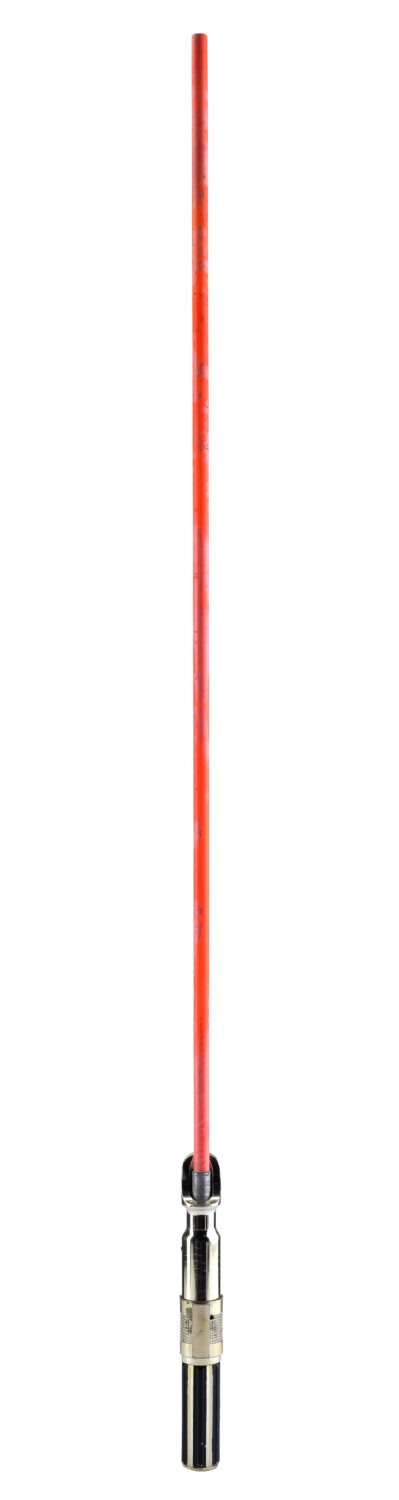 The blade itself is painted orange with a clear plastic sheath to prevent blade chips from causing injuries, all of which was digitally replaced with a glowing blue blade in post-production. This lightsaber exhibits scuffs and scratches throughout the handle, most visibly on the chrome finish, as well as small tears to the sheath, grime, and scratched-off paint on the blade. Dimensions: 123.25 cm x 4.5 cm x 4.5 cm (48.5″ x 1.75″ x 1.75″)