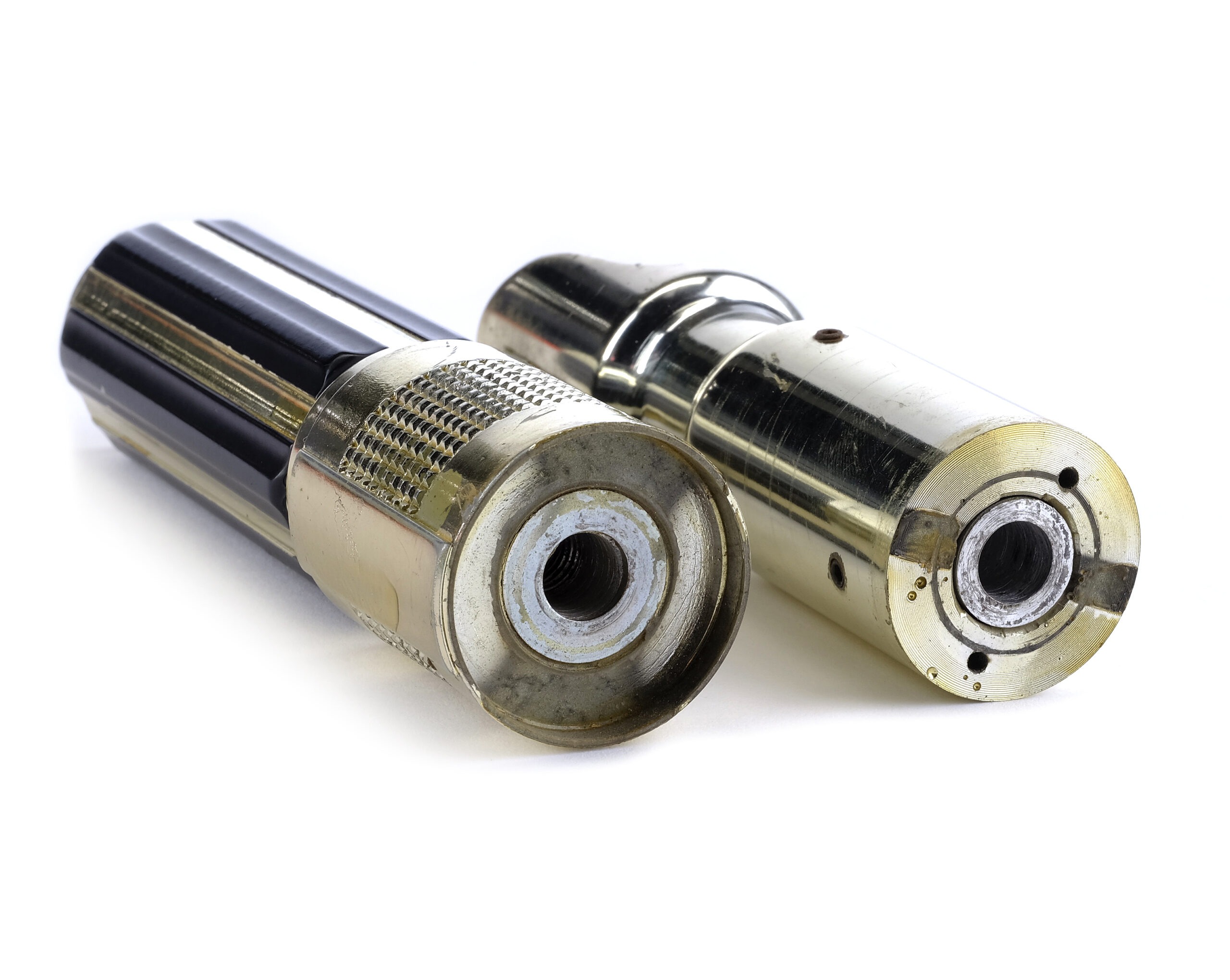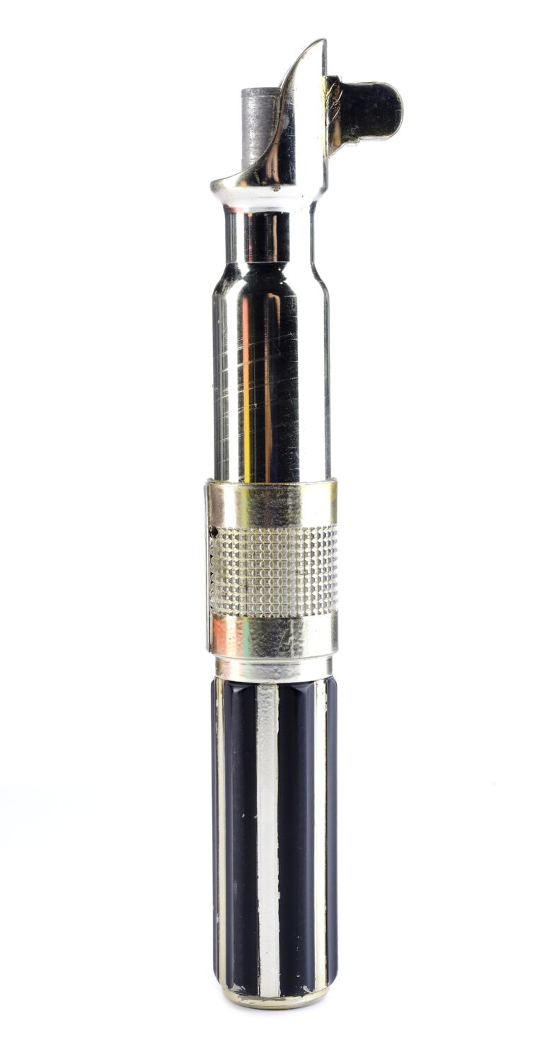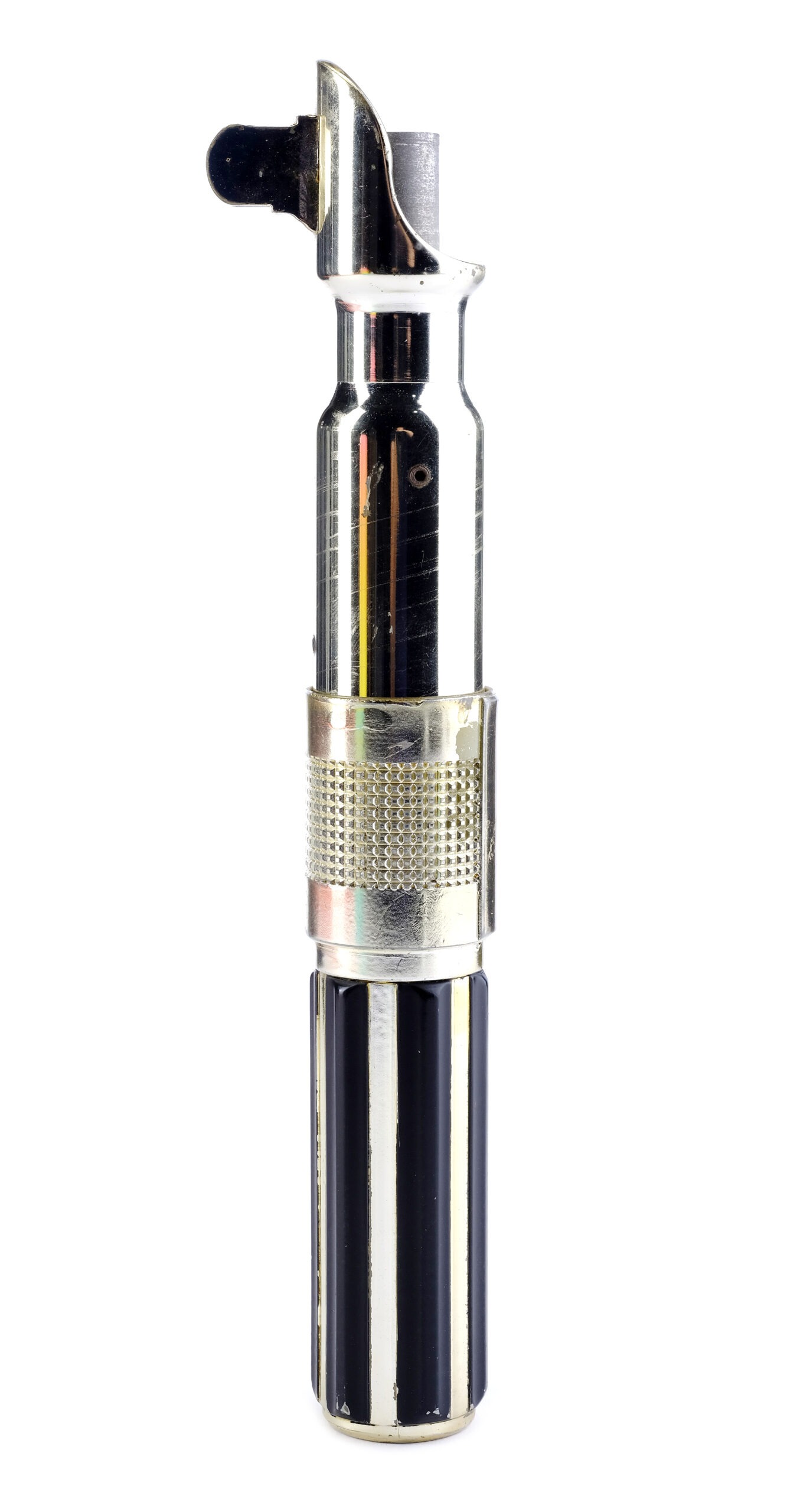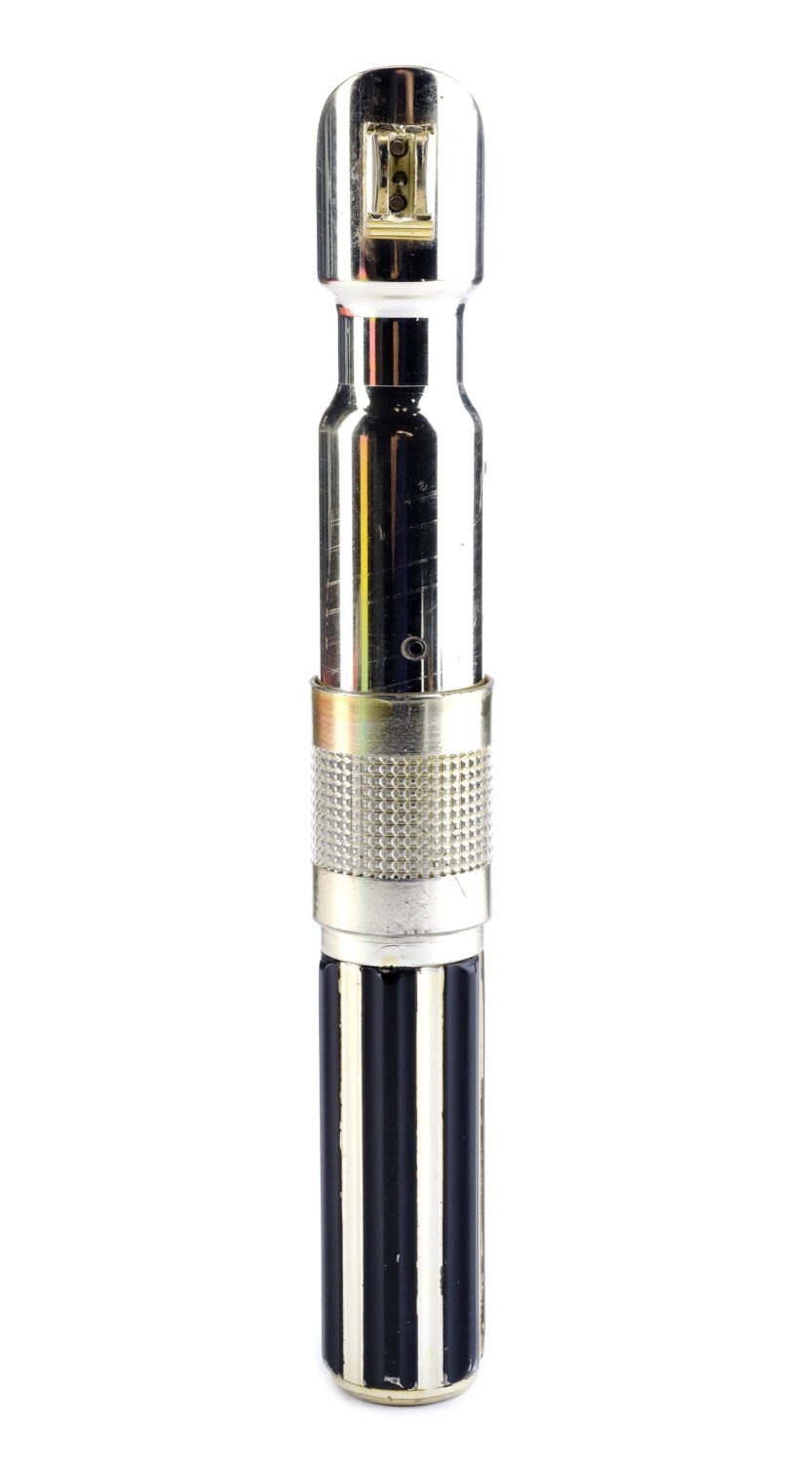 This lightsaber, a duelling version, was constructed specifically for the film and features a different design to Anakin’s first lightsaber. While similar to the hero version, this piece lacks buttons or knobs and features a lowered neck area near the emitter in order for the actor to handle and spin the weapon during action sequences. Its cast resin handle is constructed around an aluminium sleeve into which the carbon fibre blade is inserted, enabling the actors to duel onset. The handle features a chrome-plated finish with grips painted black, as well as a threaded rod securing the upper and lower sections together at the blade’s base.