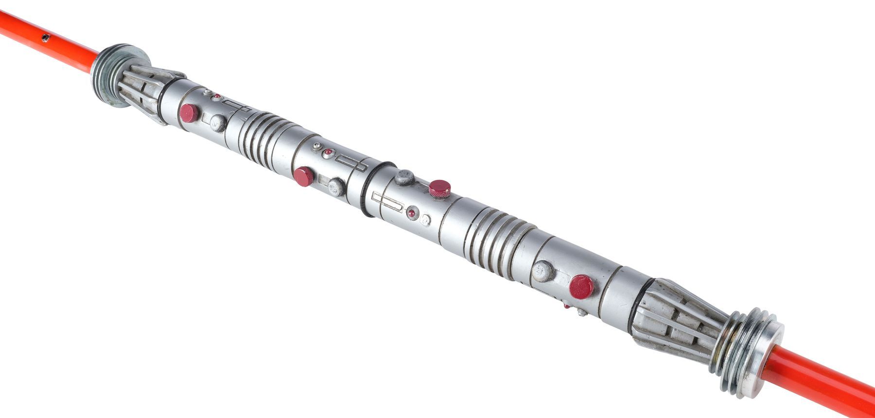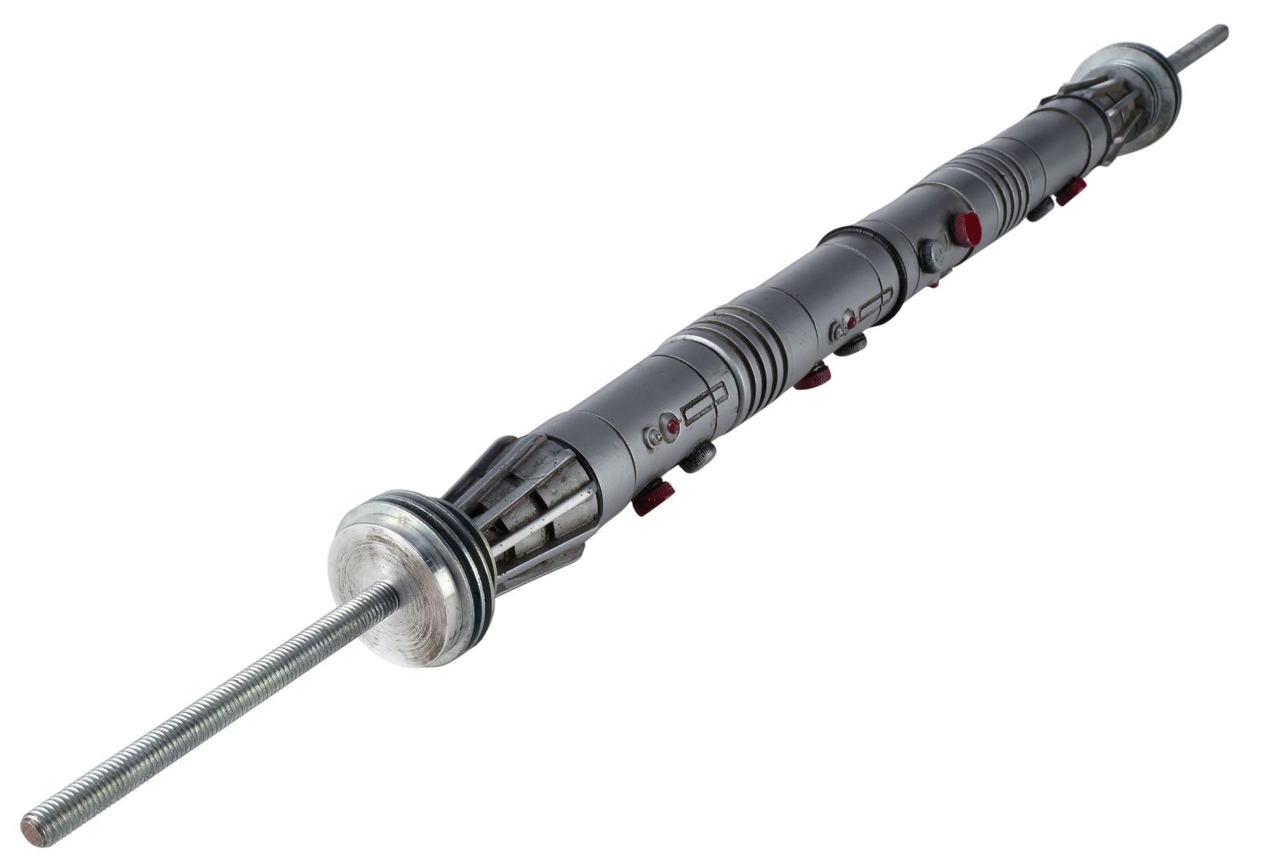 Darth Maul’s (Ray Park) lightsaber hilt from Star Wars: The Phantom Menace with two blade replicas. Darth Maul wielded his unforgettable double-bladed lightsaber during his climactic „Duel of the Fates“ battle against Qui-Gon Jinn (Liam Neeson) and Obi-Wan Kenobi (Ewan McGregor) in the Theed Palace on Naboo.
