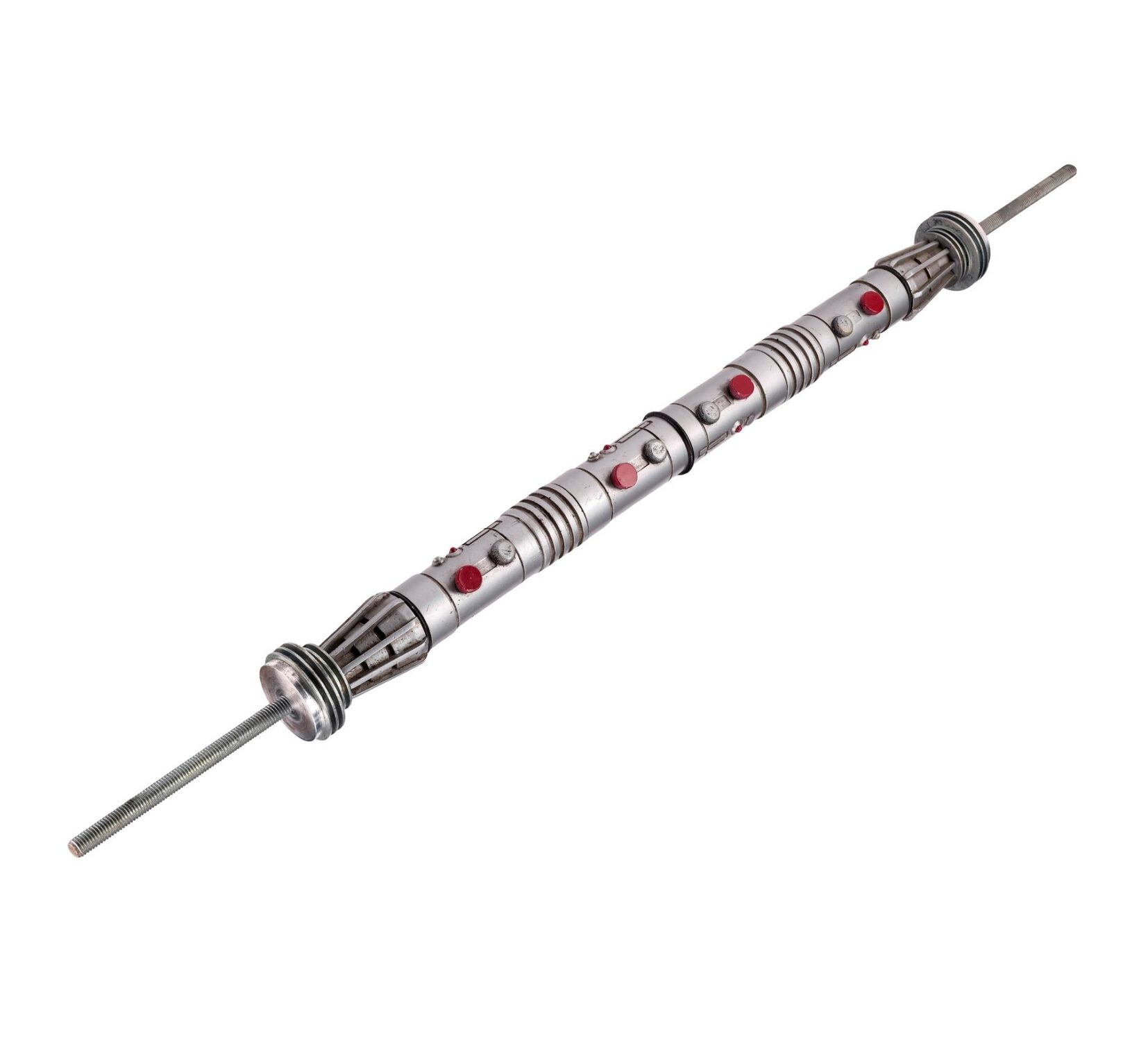 This double-ended dueling hilt, one of the most ornately and precisely detailed examples known to exist, is finished to a higher standard than most other surviving Darth Maul sabers. It originated from a crew member and is constructed from resin with machined steel end washers cast around M10 threaded rods on each end and an internal steel core for weight and strength. The threaded rods allowed for installation of aluminum blades that were used for dueling sequences and replaced frequently as they were damaged on set.
