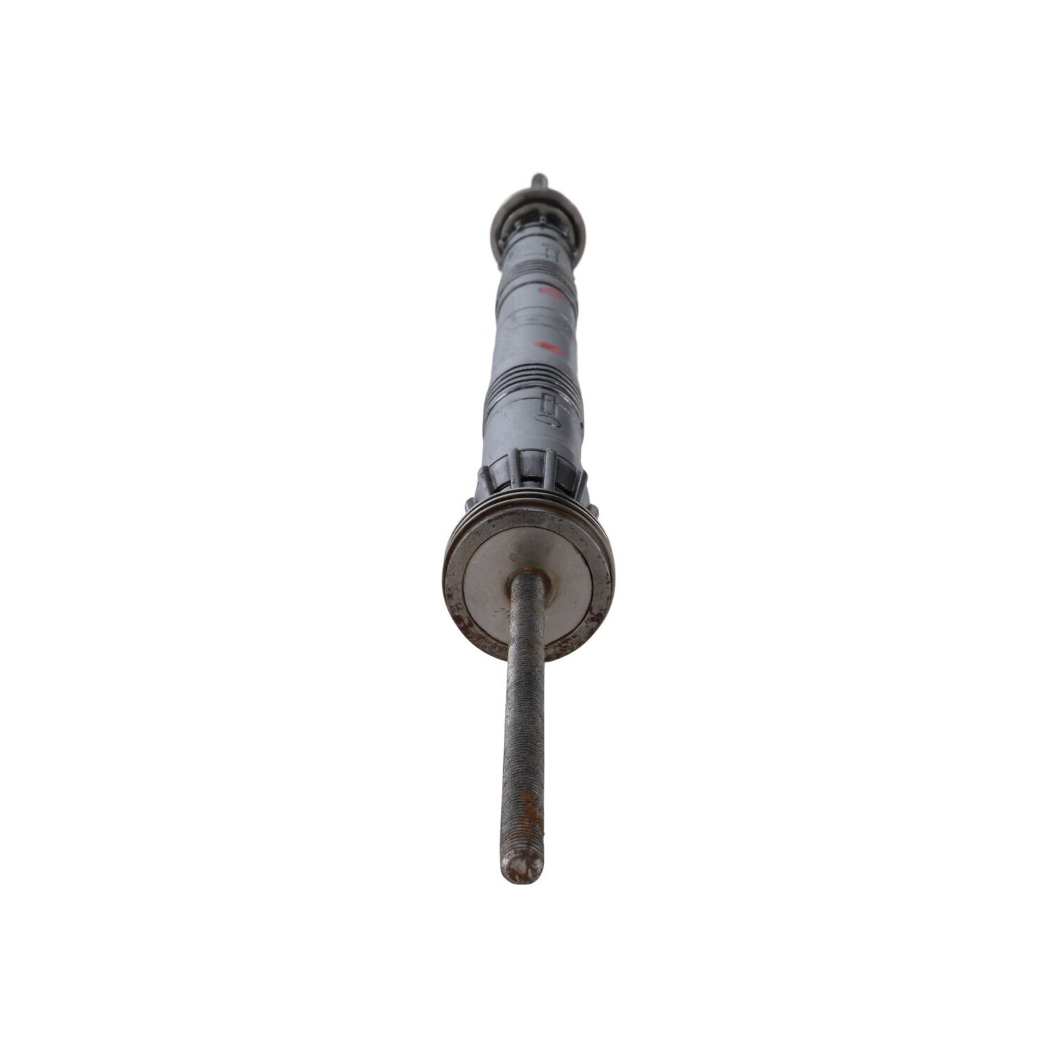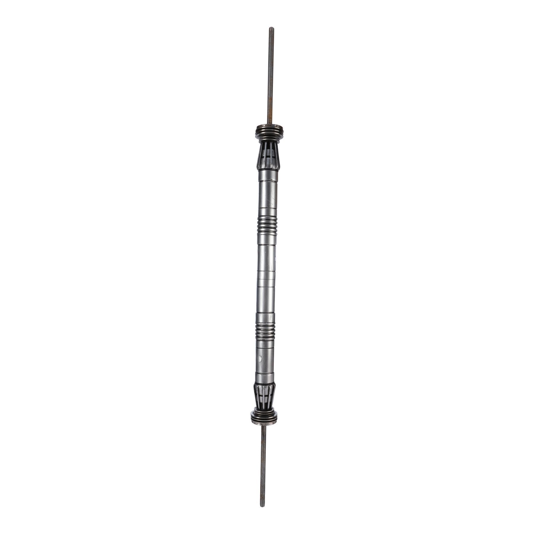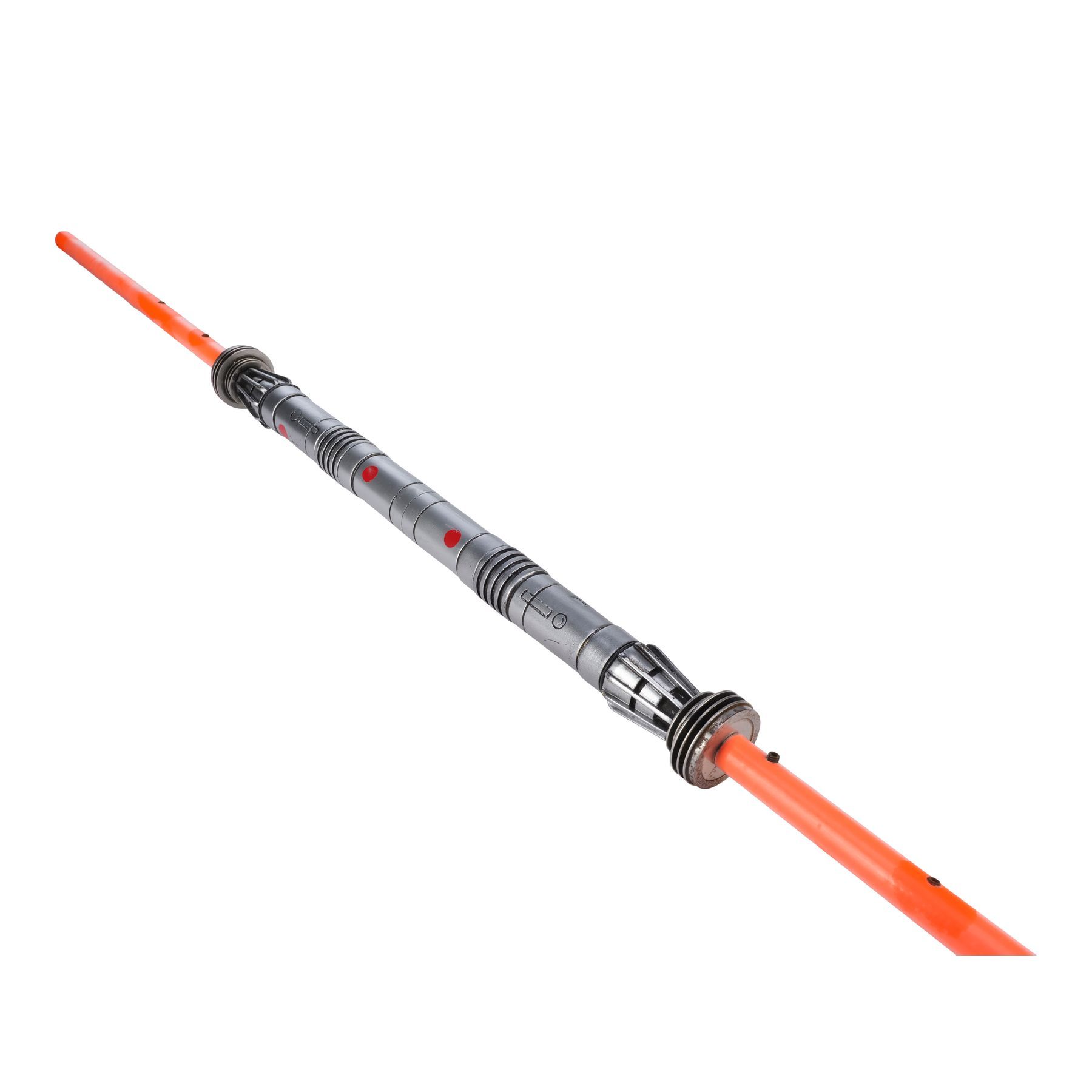 This lot consists of a resin lightsaber hilt with machined steel end caps cast around M10 threaded rods on each end and an internal steel core for weight and strength, and two short aluminium „blades“ (staffs) painted orange. The threaded rods allowed for quick installation and frequent replacement of the blades as they were damaged during dueling sequences.