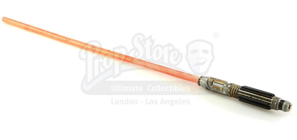 This lightsaber prop was used for dueling sequences features an aluminum „blade“ painted orange, wrapped in a clear plastic sheath, and affixed to a resin and rubber handgrip painted goldtone, silvertone, and black to simulate a metallic, electrum finish.