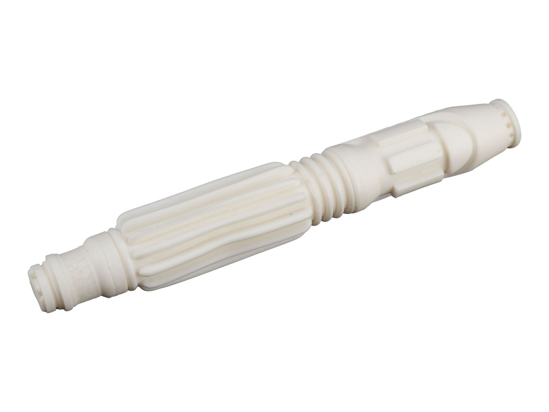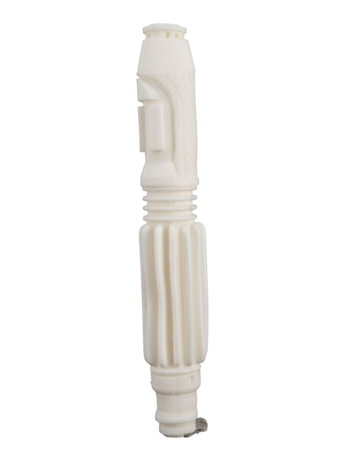 This resin lightsaber hilt casting features a white glossy finish and sculpted details. The casting exhibits some warping to the ridges of the handle. Dimensions: 11″ x 2″ x 2″ (28 cm x 5.25 cm x 5.25 cm)