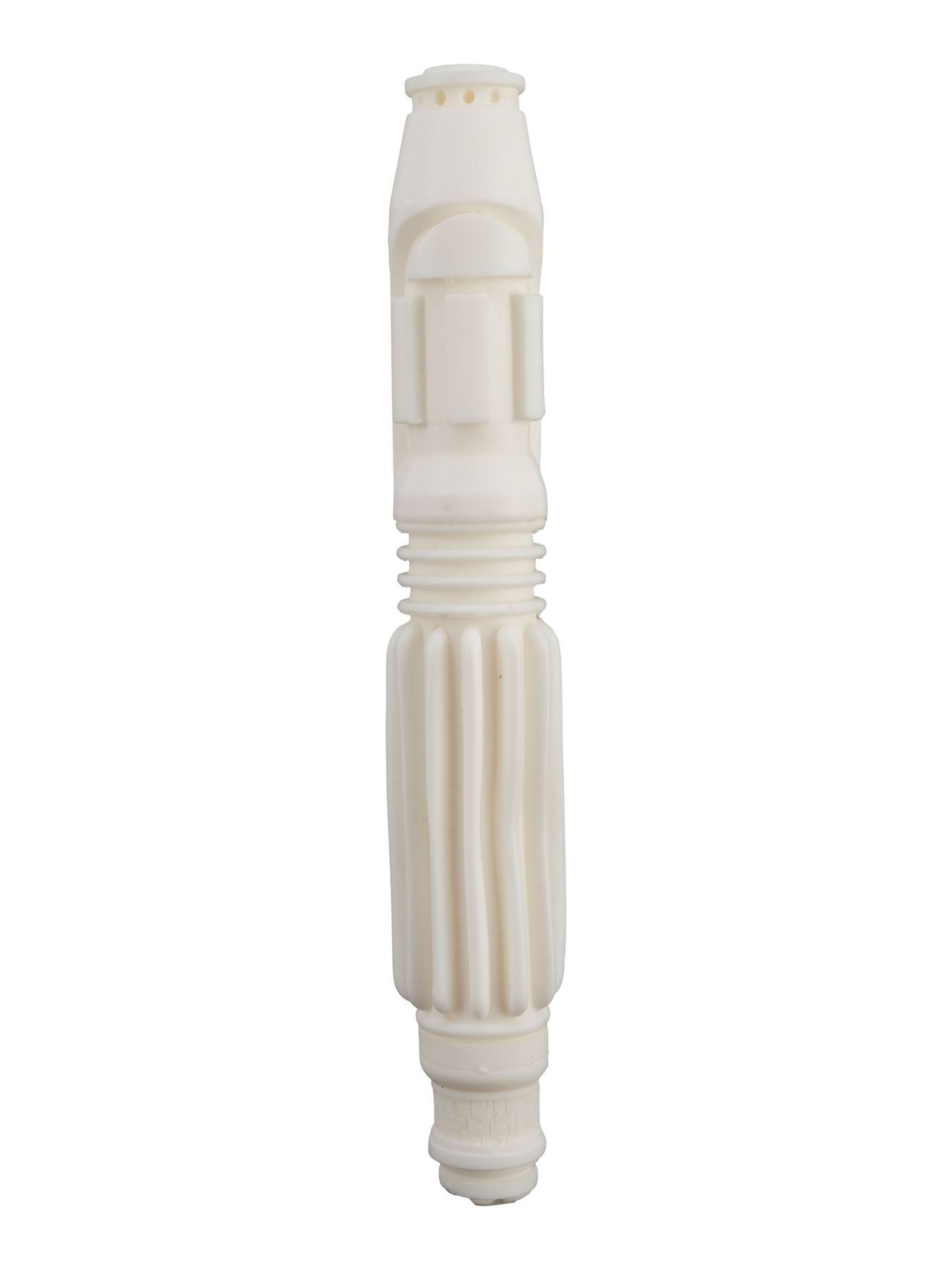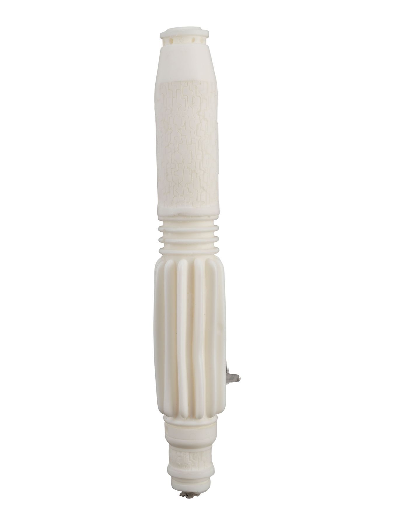 This resin lightsaber hilt casting features a white glossy finish and sculpted details. The casting exhibits some warping to the ridges of the handle. Dimensions: 11″ x 2″ x 2″ (28 cm x 5.25 cm x 5.25 cm)