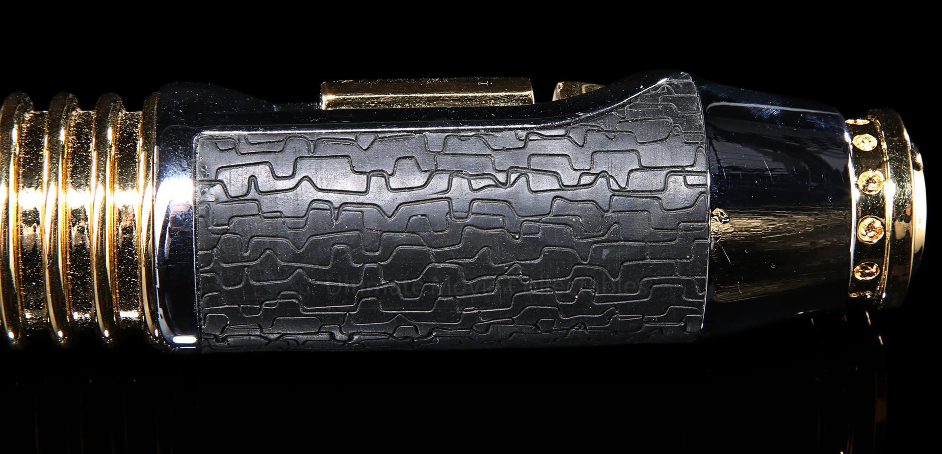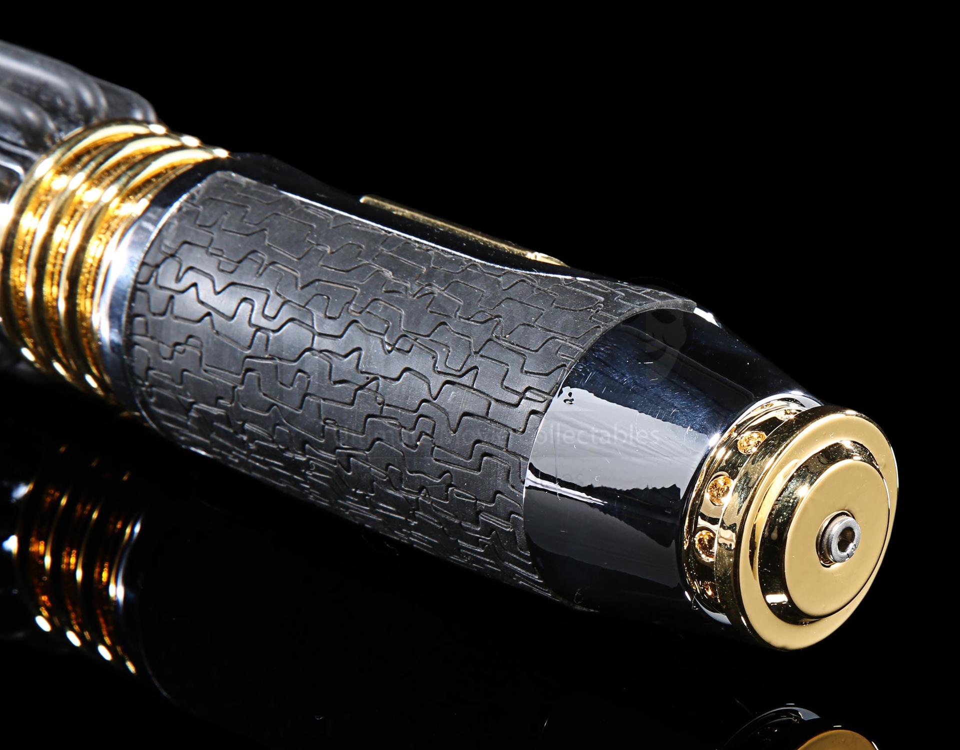 This lightsaber is a hero version, crafted in resin and vacuum-metalised with a mirror-chrome finish in silver and gold. It features a handle made of strips of black rubber and two additional rubber sections, each with an intricate lined pattern. It has some very minor wear from production use and age, with a very small amount of glue residue on the rubber handle. A letter from Gillard accompanies the lightsaber. Dimensions: 27 cm x 4.5 cm x 4.5 cm (10 1/2″ x 1 3/4″ x 1 3/4″)