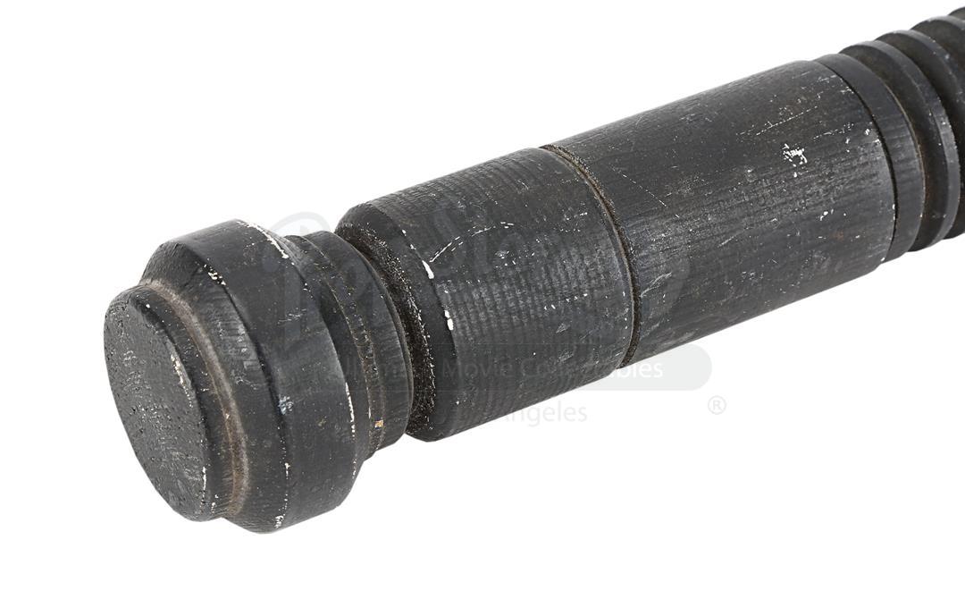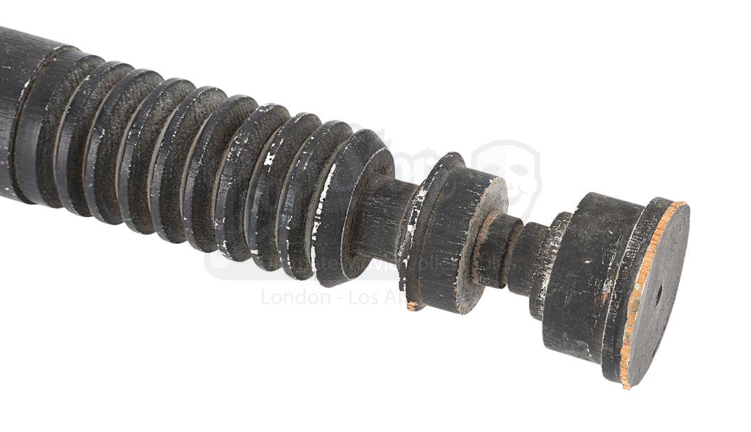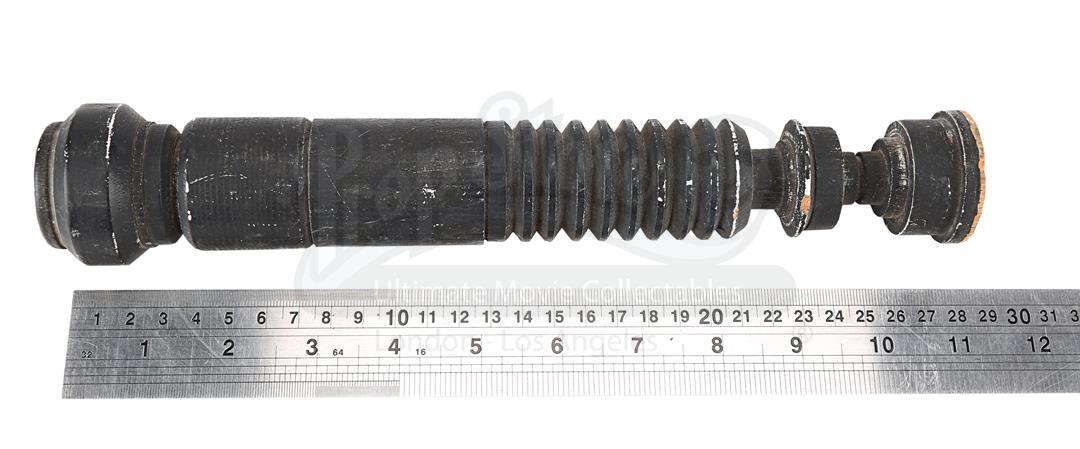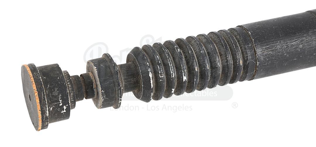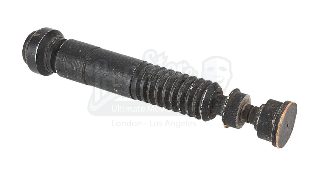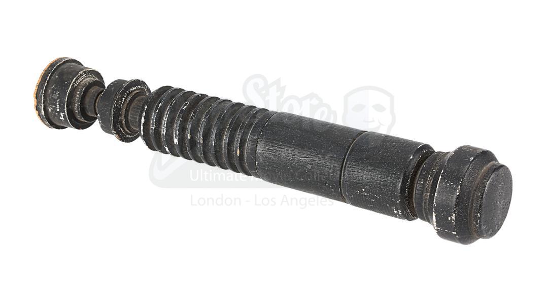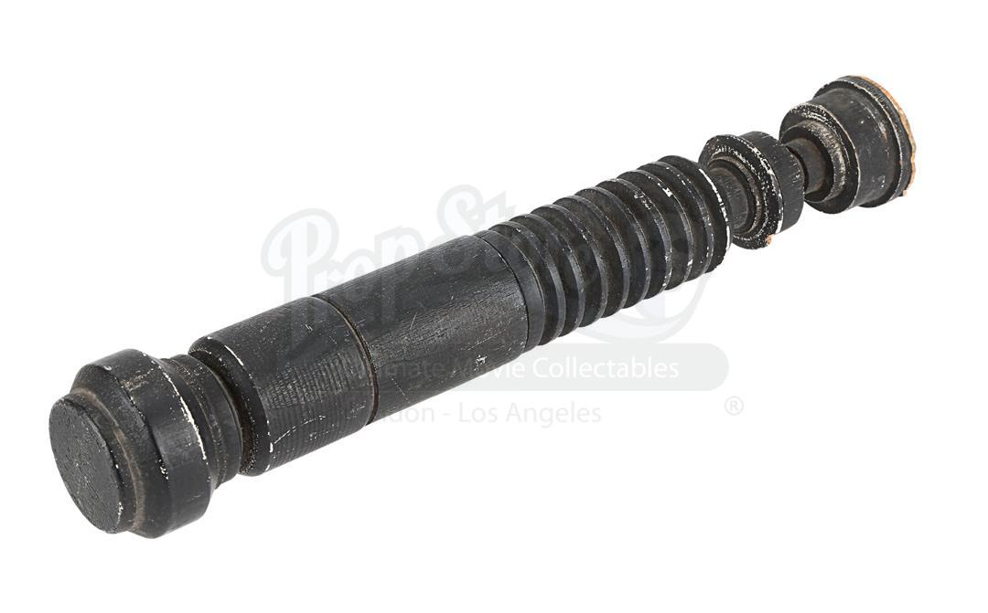 An Obi-Wan Kenobi first-turned wooden prototype lightsaber, from the production of George Lucas‘ Star Wars: A New Hope. The lightsaber, conceptualised by George Lucas and constructed by John Stears and Roger Christian, was made from camera flash handles, battery packs and other hardware. The design was altered for different characters‘ lightsabers, including Obi-Wan Kenobi’s (Alec Guinness), which utilised plumbing equipment and a World War I British grenade in its construction.
