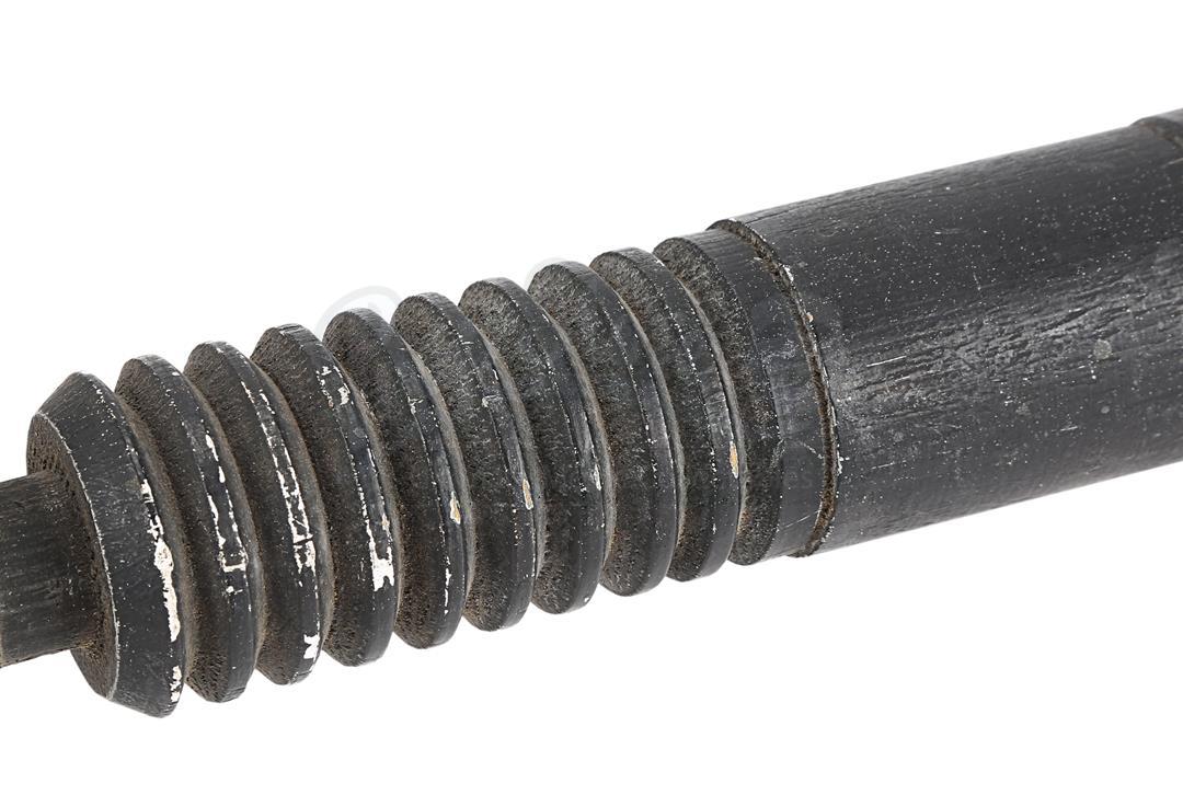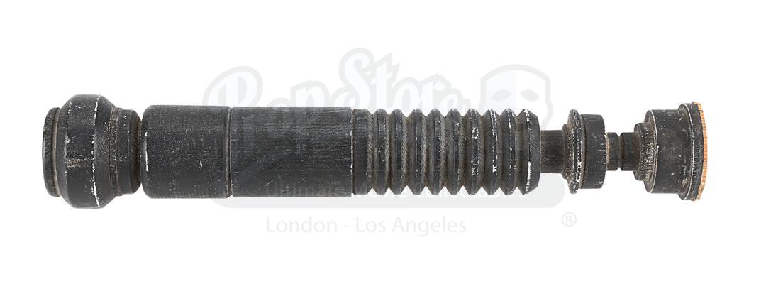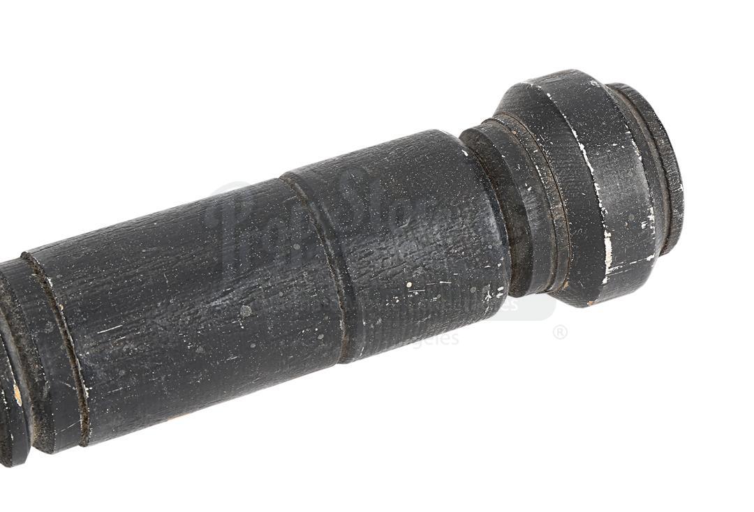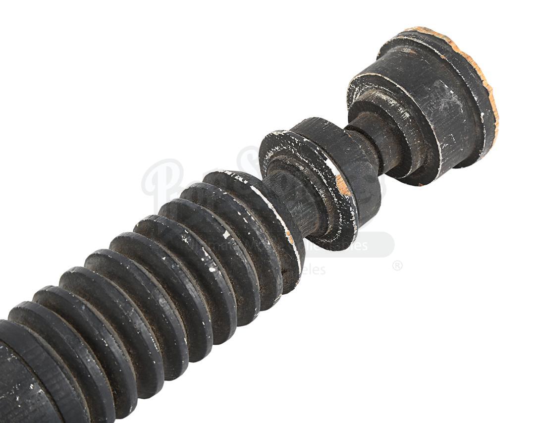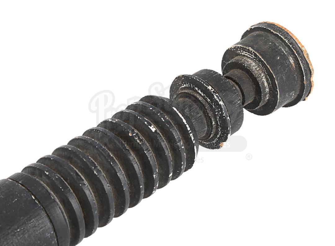 An Obi-Wan Kenobi first-turned wooden prototype lightsaber, from the production of George Lucas‘ Star Wars: A New Hope. The lightsaber, conceptualised by George Lucas and constructed by John Stears and Roger Christian, was made from camera flash handles, battery packs and other hardware. The design was altered for different characters‘ lightsabers, including Obi-Wan Kenobi’s (Alec Guinness), which utilised plumbing equipment and a World War I British grenade in its construction.