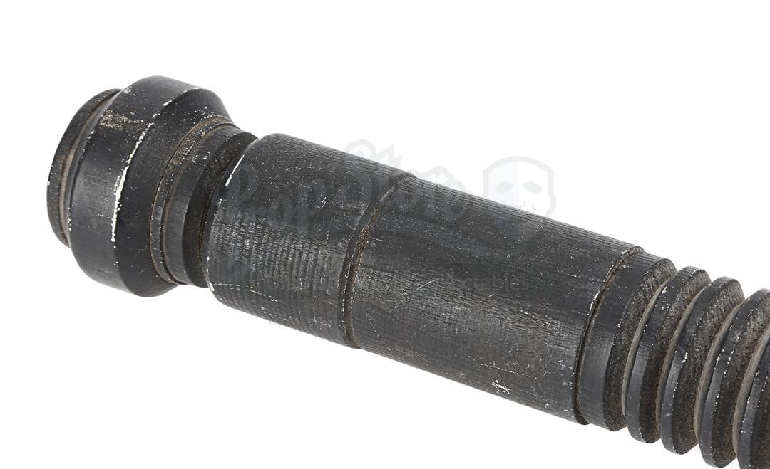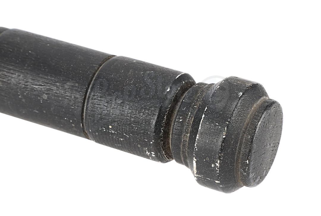 This piece is the woodworked master used to create the lightsaber moulds. Carved on a lathe and painted with a white undercoat and a black topcoat, the prototype has a hole for the lathe’s drive centre and another for a mould pour entrance. The saber shows wear from production use and aging, the paint has chipped away from most edges, and the rim of the end disc has broken off entirely. Dimensions: 28.5 cm x 5 cm x 5 cm (11 1/4″ x 2″ x 2″)