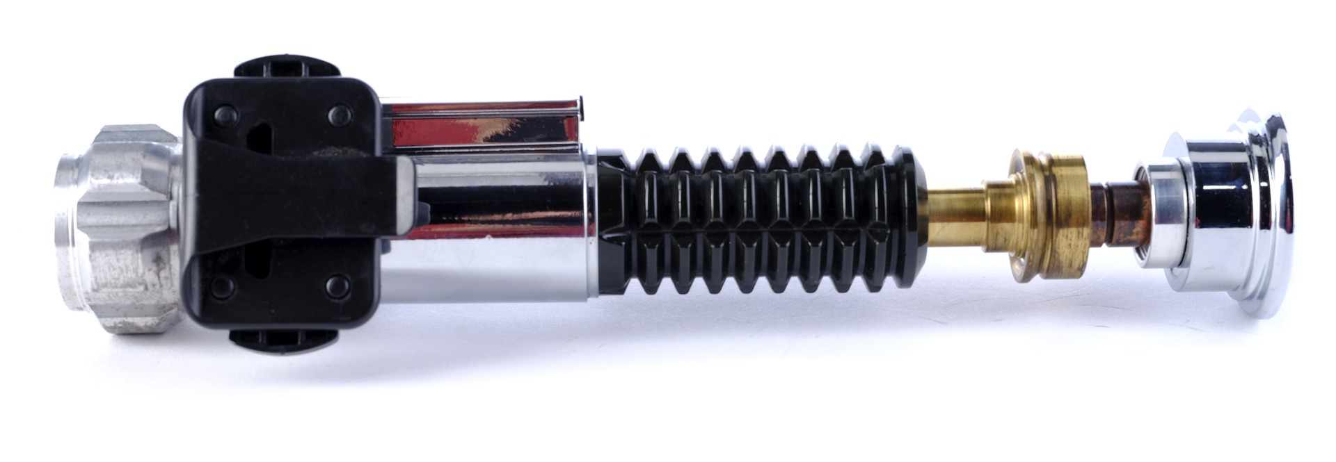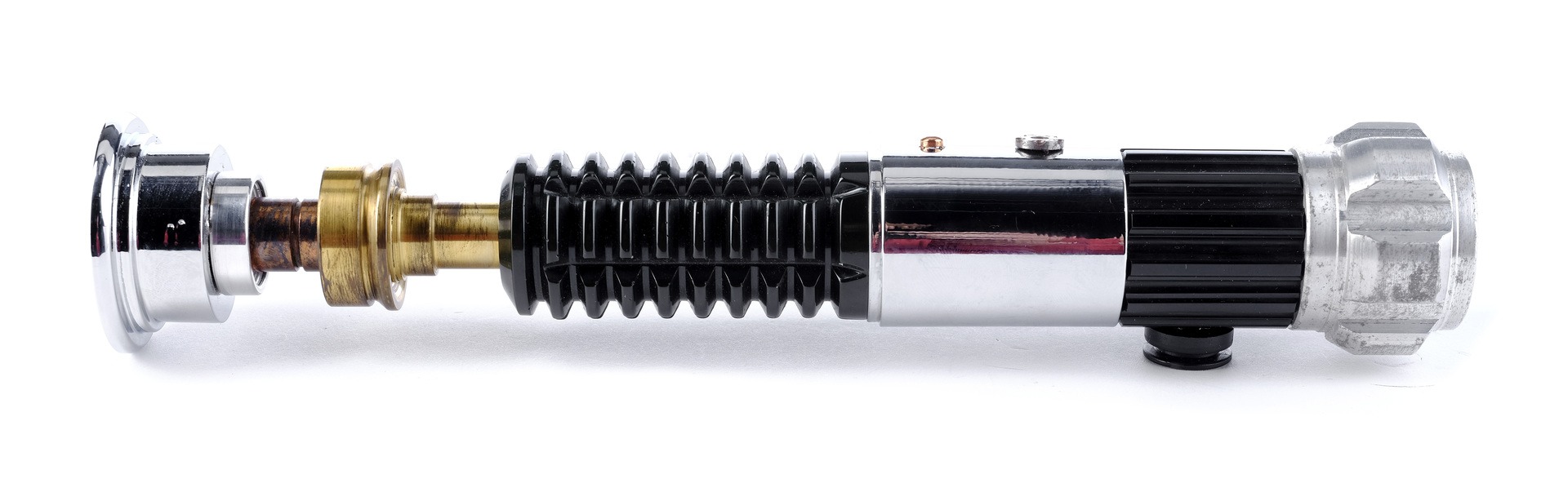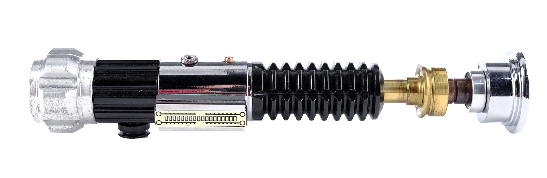 This hilt was specifically constructed for the third prequel film and is a different design to the lightsaber wielded by Obi-Wan in the prior two Star Wars episodes. Like Anakin Skywalker’s lightsaber, this lightsaber design links directly to Star Wars: A New Hope, where Alec Guinness appeared with a similar prop as the older Kenobi. It is therefore one of the most iconic lightsaber designs in the Star Wars saga.