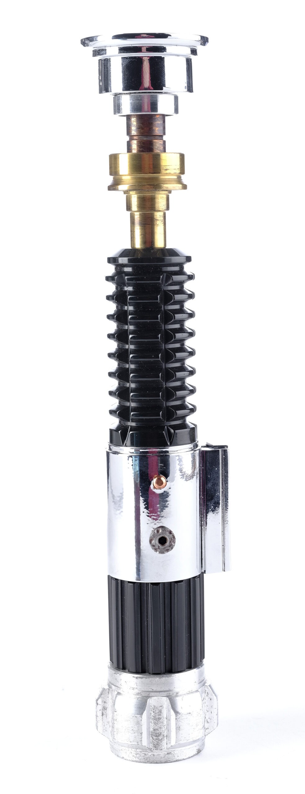 Obi-Wan Kenobi’s (Ewan McGregor) hero lightsaber hilt with metal components from George Lucas‘ Star Wars: Revenge of the Sith. Jedi Master Obi-Wan wielded his signature blue lightsaber throughout the film, including during his fateful duel with Anakin Skywalker (Hayden Christensen) on the fiery surface of Mustafar.