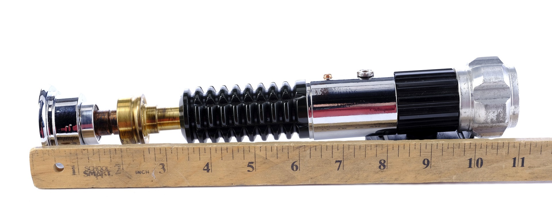 Hero lightsaber hilts were made to be carried by the actors on their belts and in shots where the blades were not ignited. This hero hilt was made early on in production and therefore incorporates metal components; later in production additional hilts were needed, and they were all plastic-cast components in order to be produced as fast as possible. The metal elements on this lightsaber include the end pommel, the detail greeblies near the control box, the full neck vane assembly including the gold-colored component above the grip, the thin copper-colored section, and the aluminum base below the emitter. The black ridged section above the pommel, the control box section,the ridged black handgrip and the emitter are cast plastic, with some components chrome-plated. Also included is an original belt clip. The lightsaber shows slight wear throughout from production use and age. Dimensions: 11″ x 3″ x 3″ (28 cm x 7.75 cm x 7.75 cm)