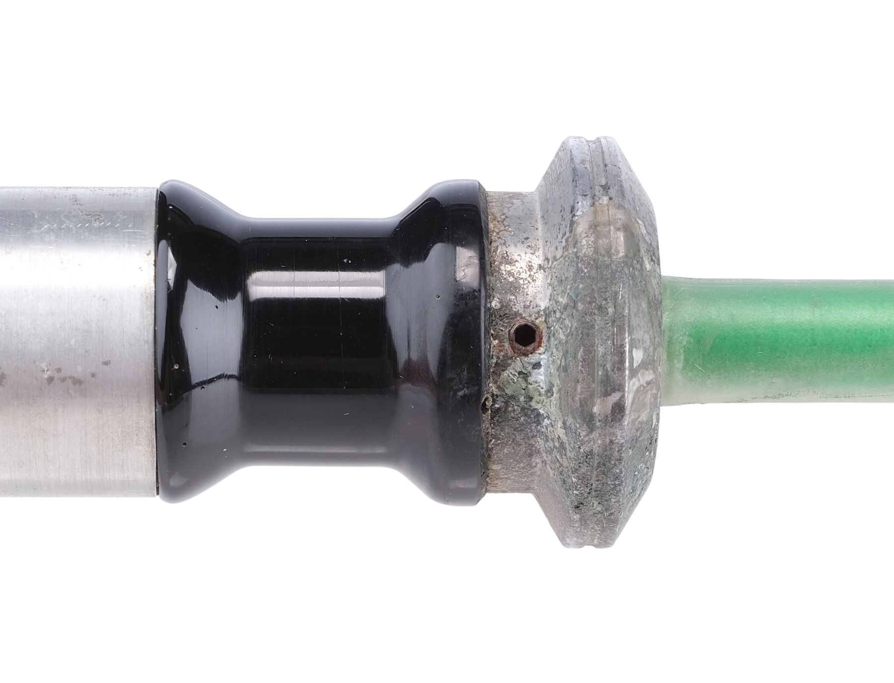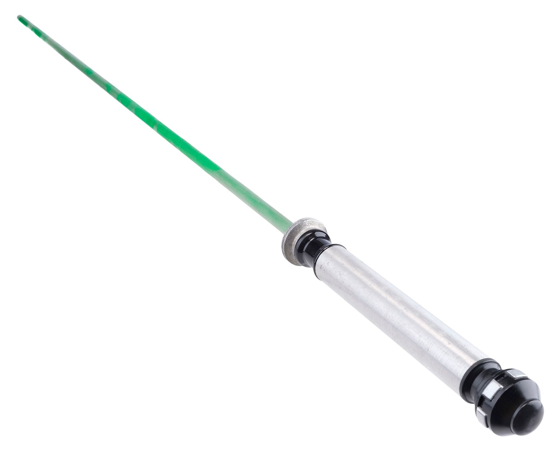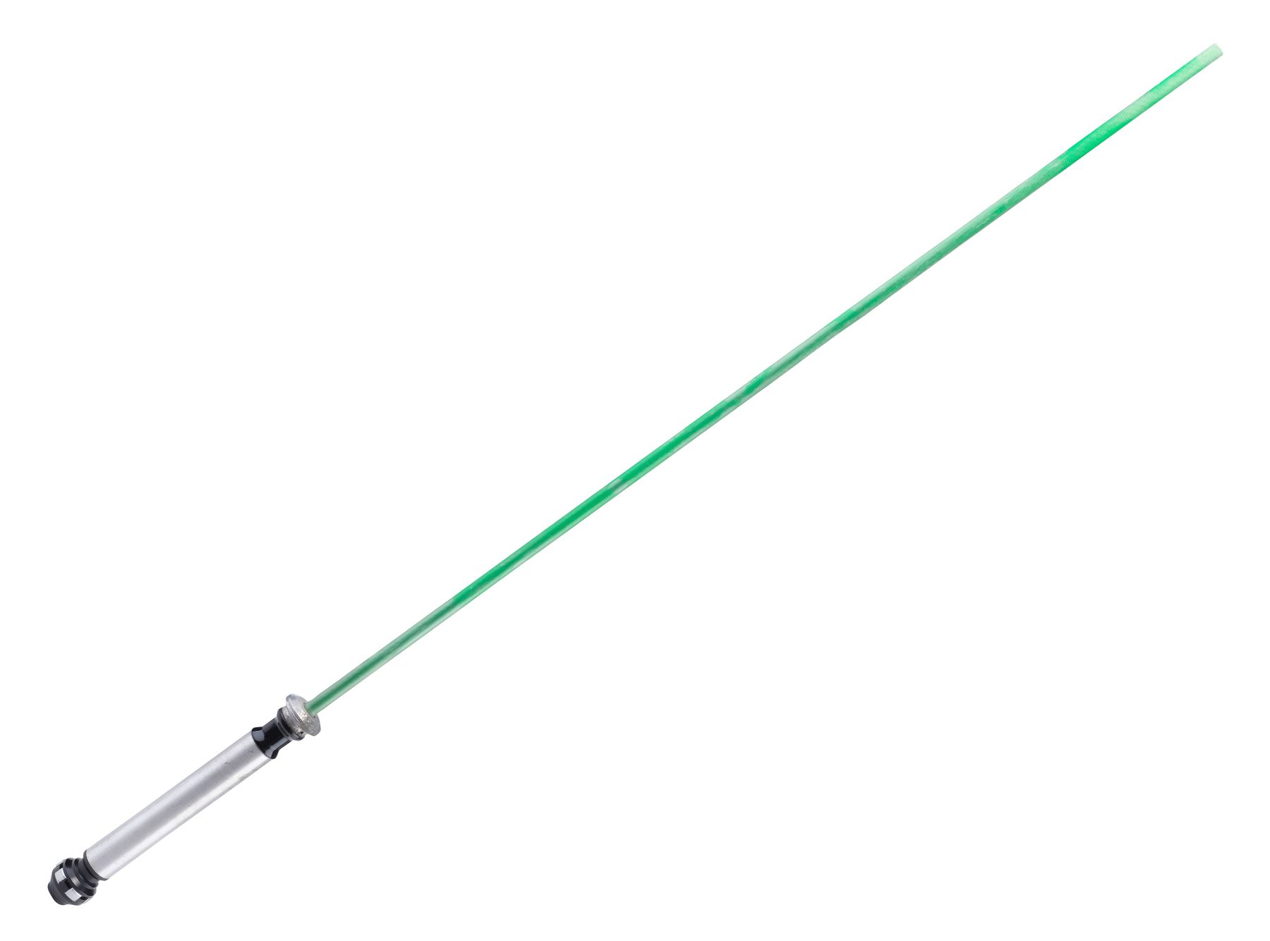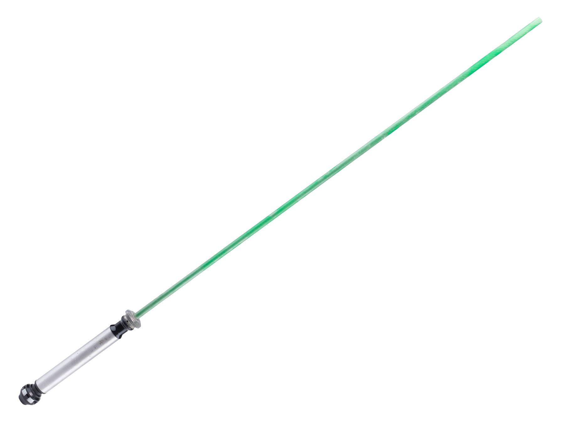 This lot consists of a painted lightsaber hilt, a resin and metal handgrip, a rounded pommel cap inset with a threaded metal rod, and a carbon fiber blade painted to be digitally overlaid with visual effects to produce its iconic glow. This rehearsal lightsaber’s hilt is in the style carried by Kenobi in The Phantom Menace and Attack of the Clones, as it was originally planned for Kenobi to transition to his A New Hope hilt mid-film, but it was ultimately decided to instead have Kenobi wield his updated lightsaber from the beginning of the film. The hilt and blade exhibit nicking and scuffing throughout from production and handling. Dimensions: 49.5″ x 2″ x 2″ (125.75 cm x 5.25 cm x 5.25 cm)