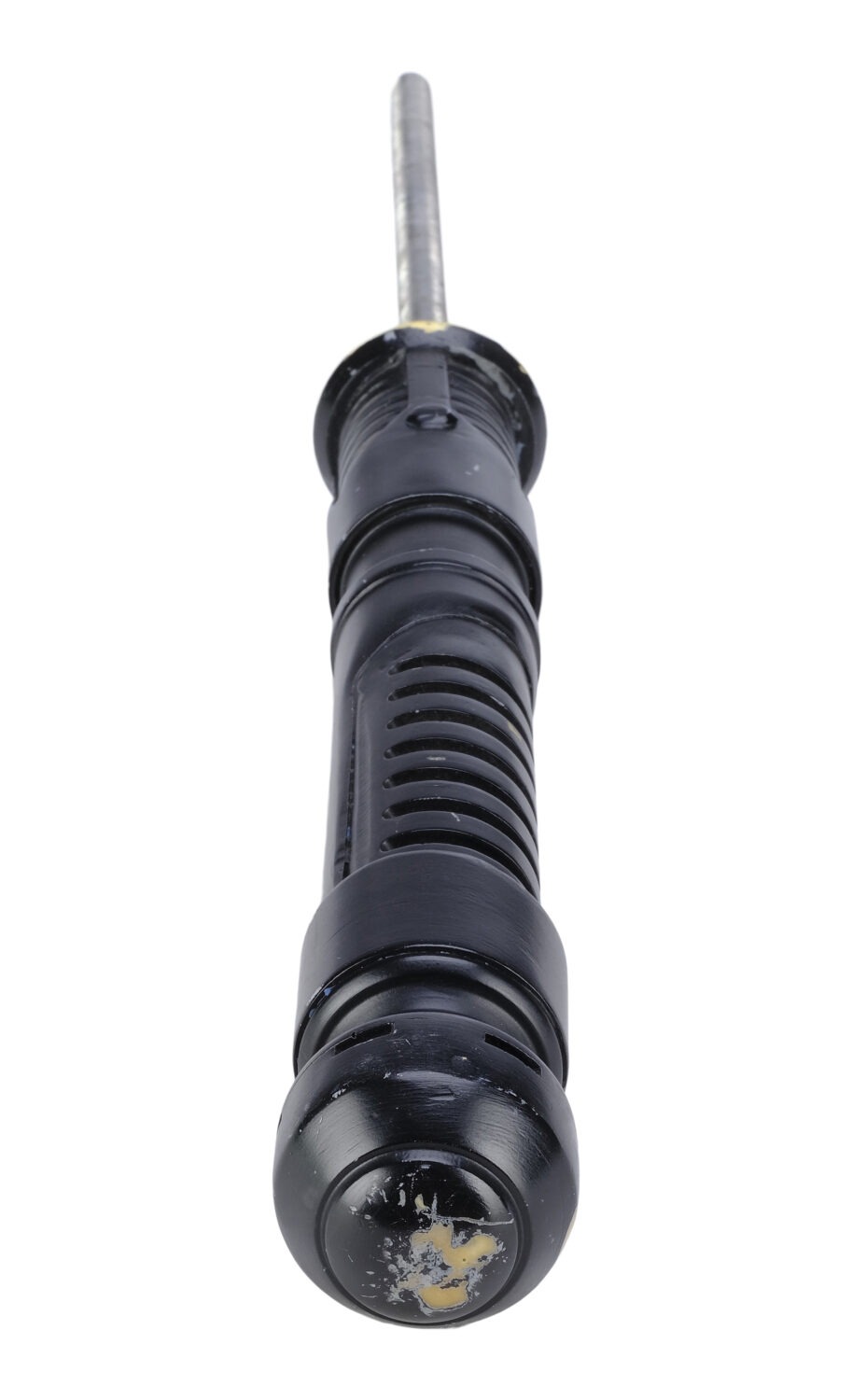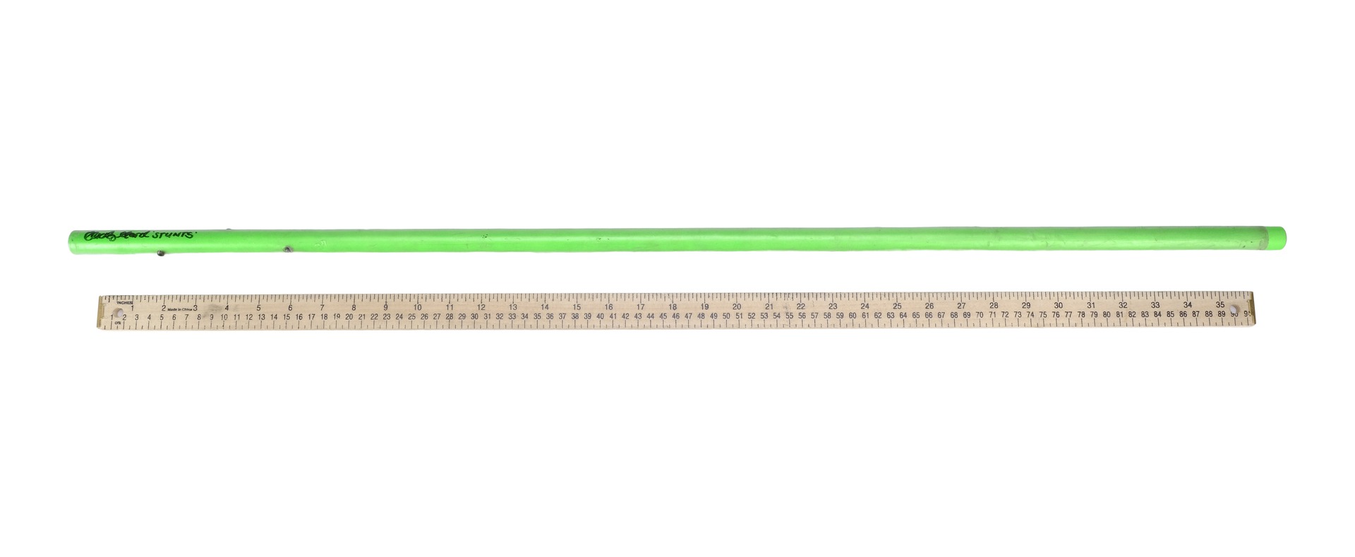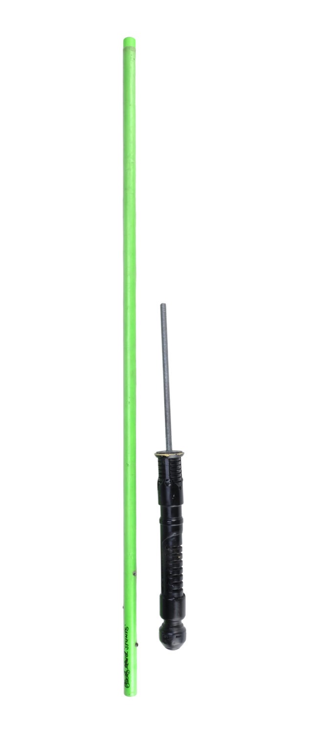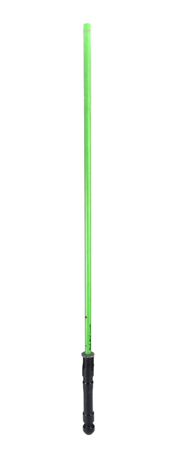 This lightsaber was used by McGregor during training for the film and is signed by the film’s stunt coordinator and lightsaber choreographer, Nick Gillard. It features a green aluminium blade wrapped in a clear plastic sleeve and a resin handle that is painted solid black. The blade is thicker and heavier than the standard type used during filming, so it would not easily bend. The lightsaber exhibits some impact marks on the blade’s sleeve from duelling, wear on the handle, and scratching in the signature. Dimensions: 2″ x 2″ x 42″ (5 cm x 5 cm x 106.75 cm)