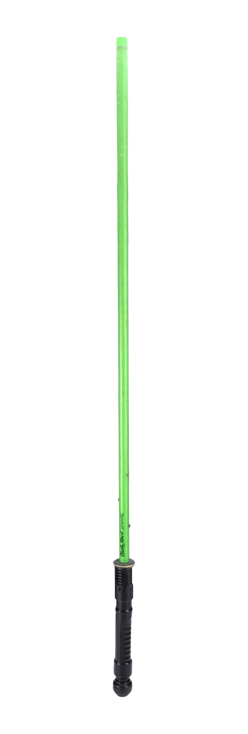 This lightsaber was used by McGregor during training for the film and is signed by the film’s stunt coordinator and lightsaber choreographer, Nick Gillard. It features a green aluminium blade wrapped in a clear plastic sleeve and a resin handle that is painted solid black. The blade is thicker and heavier than the standard type used during filming, so it would not easily bend. The lightsaber exhibits some impact marks on the blade’s sleeve from duelling, wear on the handle, and scratching in the signature. Dimensions: 2″ x 2″ x 42″ (5 cm x 5 cm x 106.75 cm)