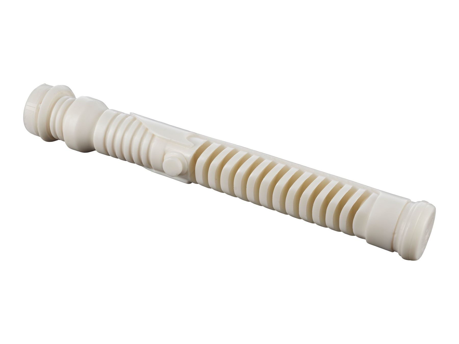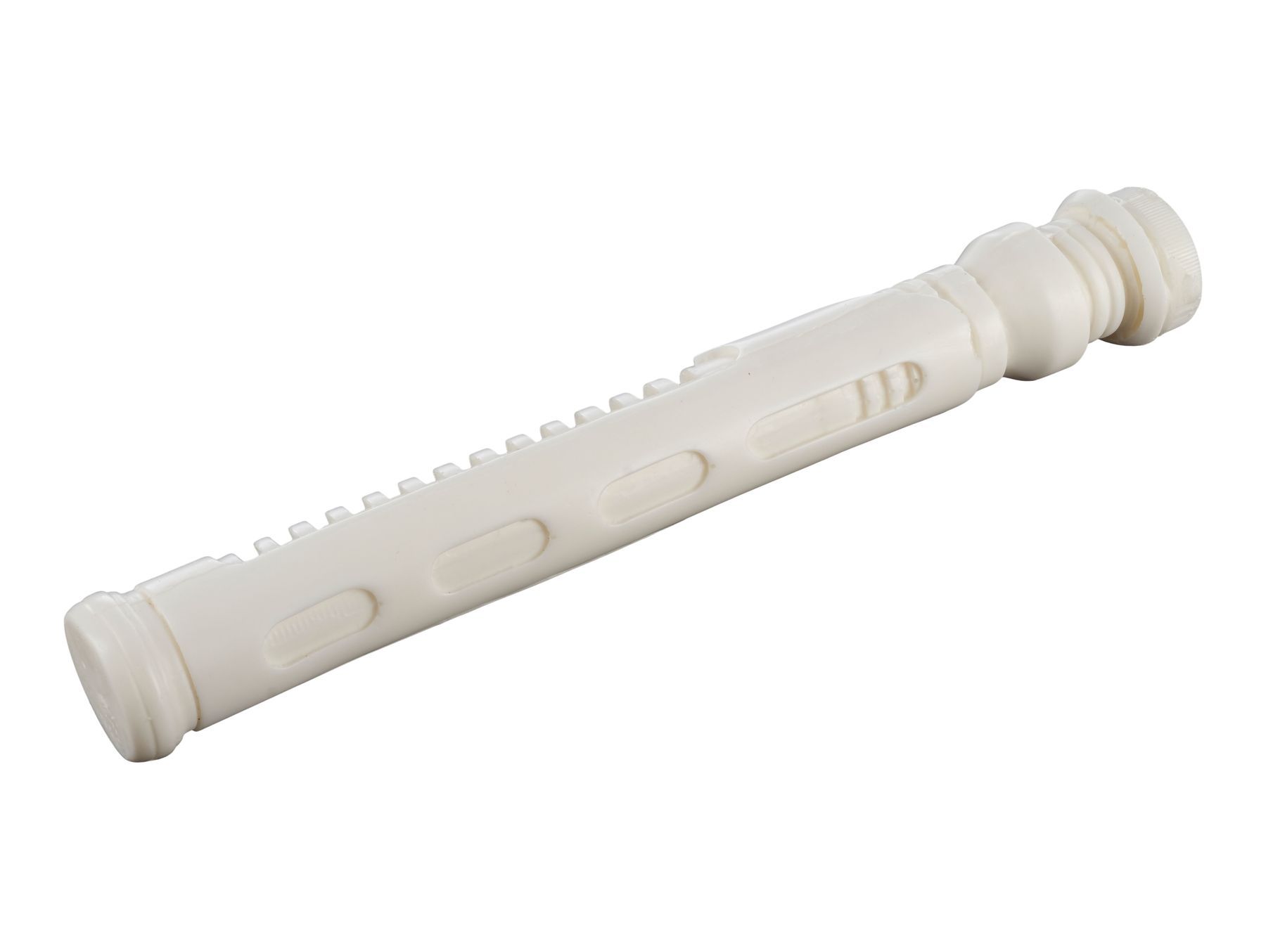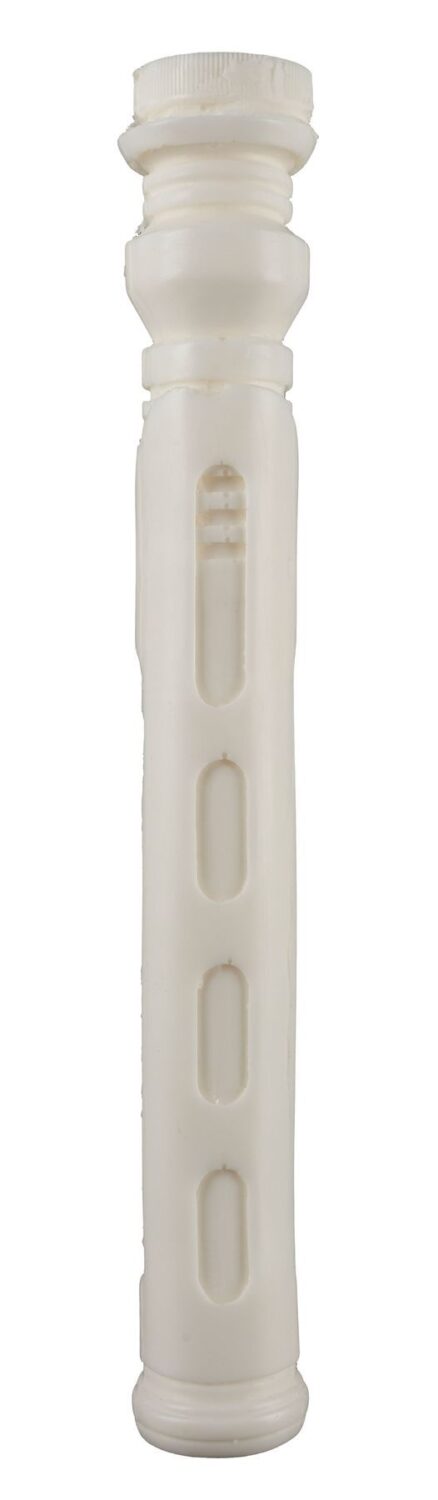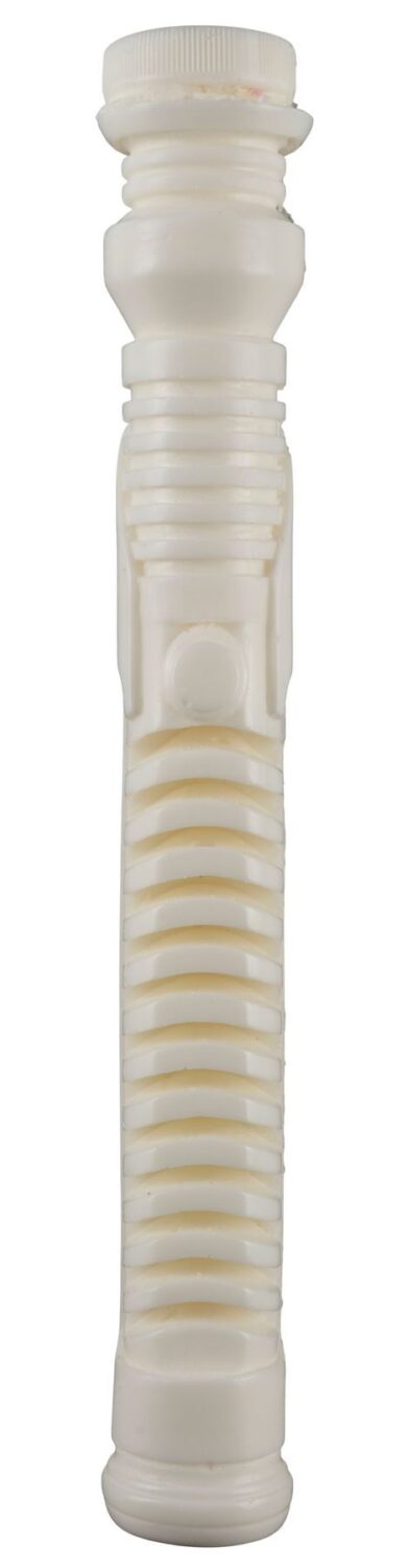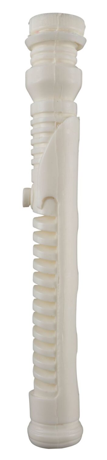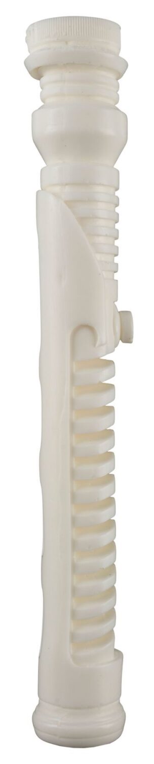 This resin lightsaber hilt casting features a white glossy finish and sculpted details. The casting exhibits minor bits of untrimmed flash from the casting process. Dimensions: 11″ x 2″ x 2″ (28 cm x 5.25 cm x 5.25 cm)