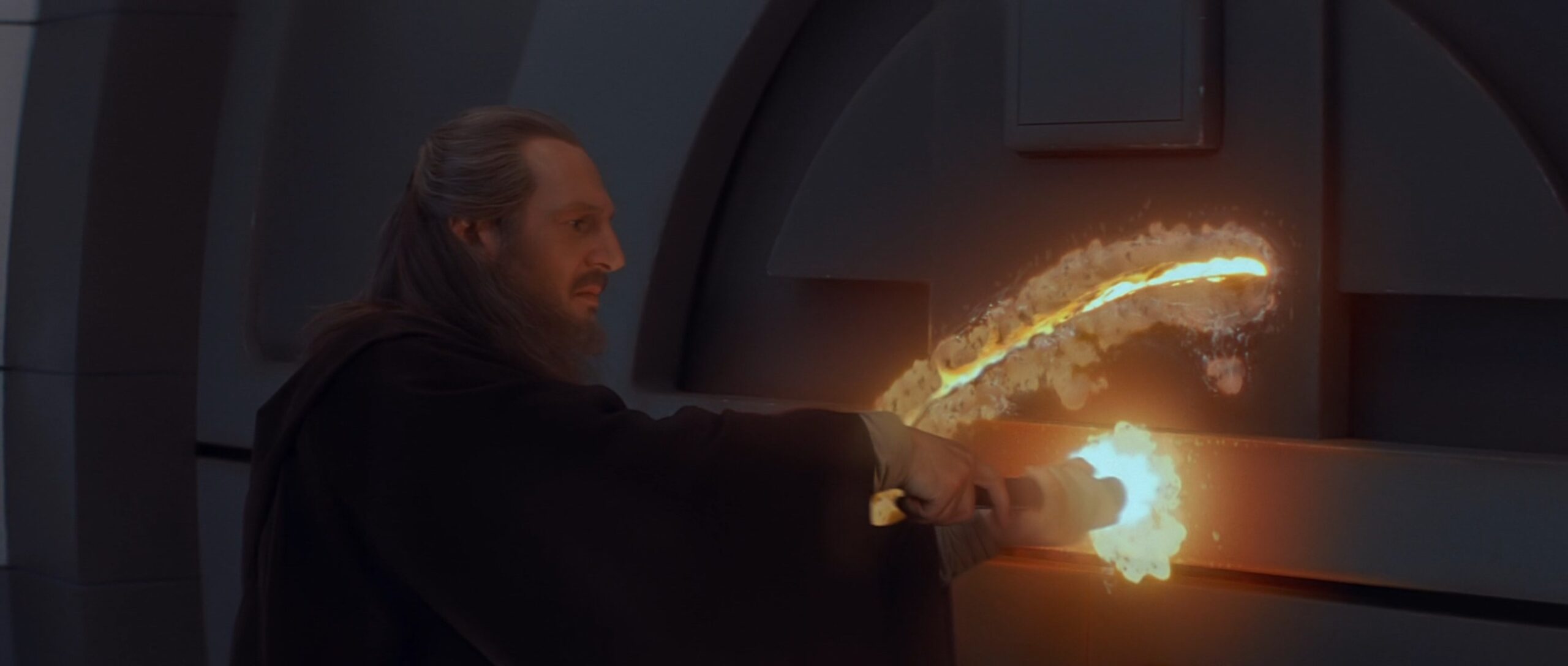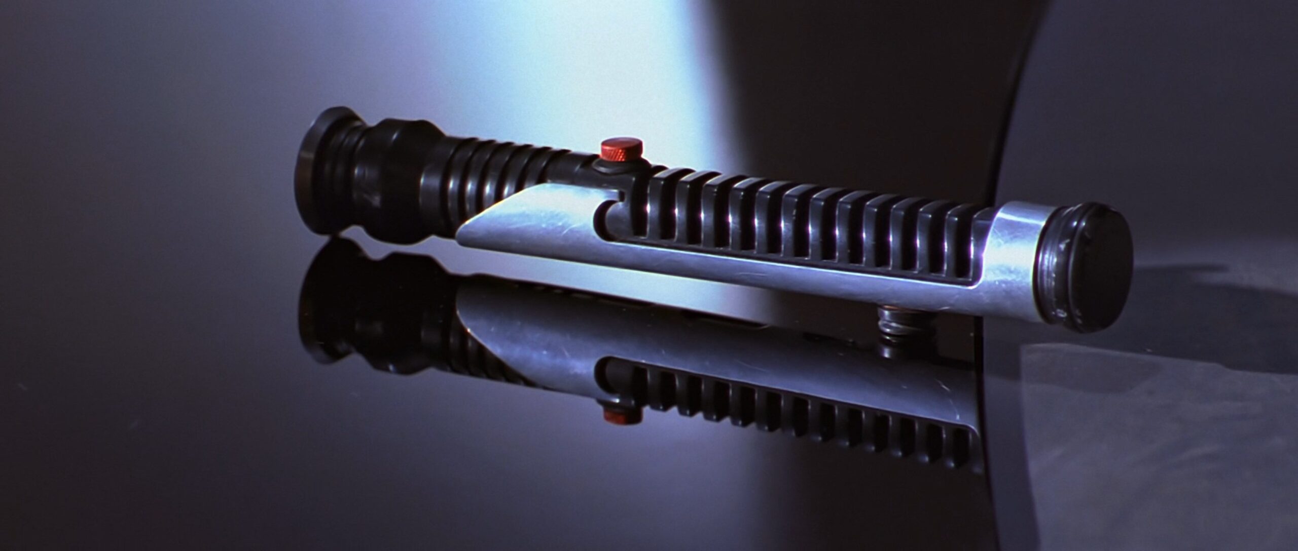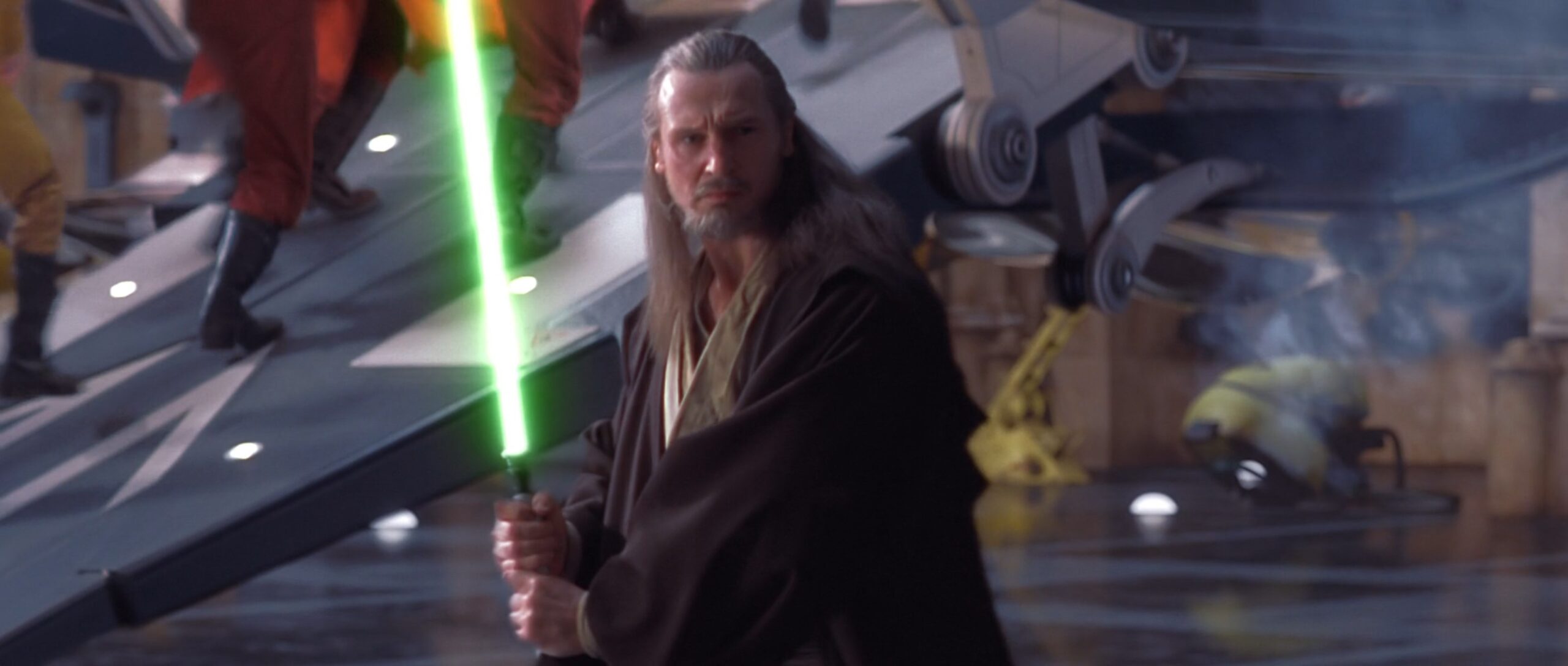 Das Lichtschwert von Qui-Gon Jinn besitzt ein schlichtes, aber elegantes Design mit einem markanten, silbernen Metall-Overlay und schwarzen Griffpartien für besseren Halt. Es begleitete ihn bis zu seinem letzten Duell auf Naboo, wo er im Kampf gegen Darth Maul tödlich verwundet wurde. Danach nutze sein Padawan, Obi-Wan Kenobi es, um den Sith Lord zweizuteilen.