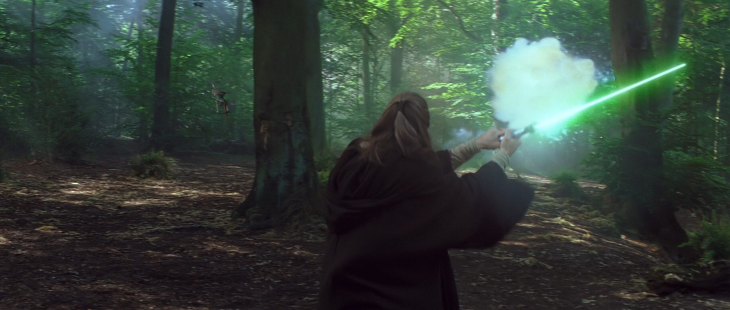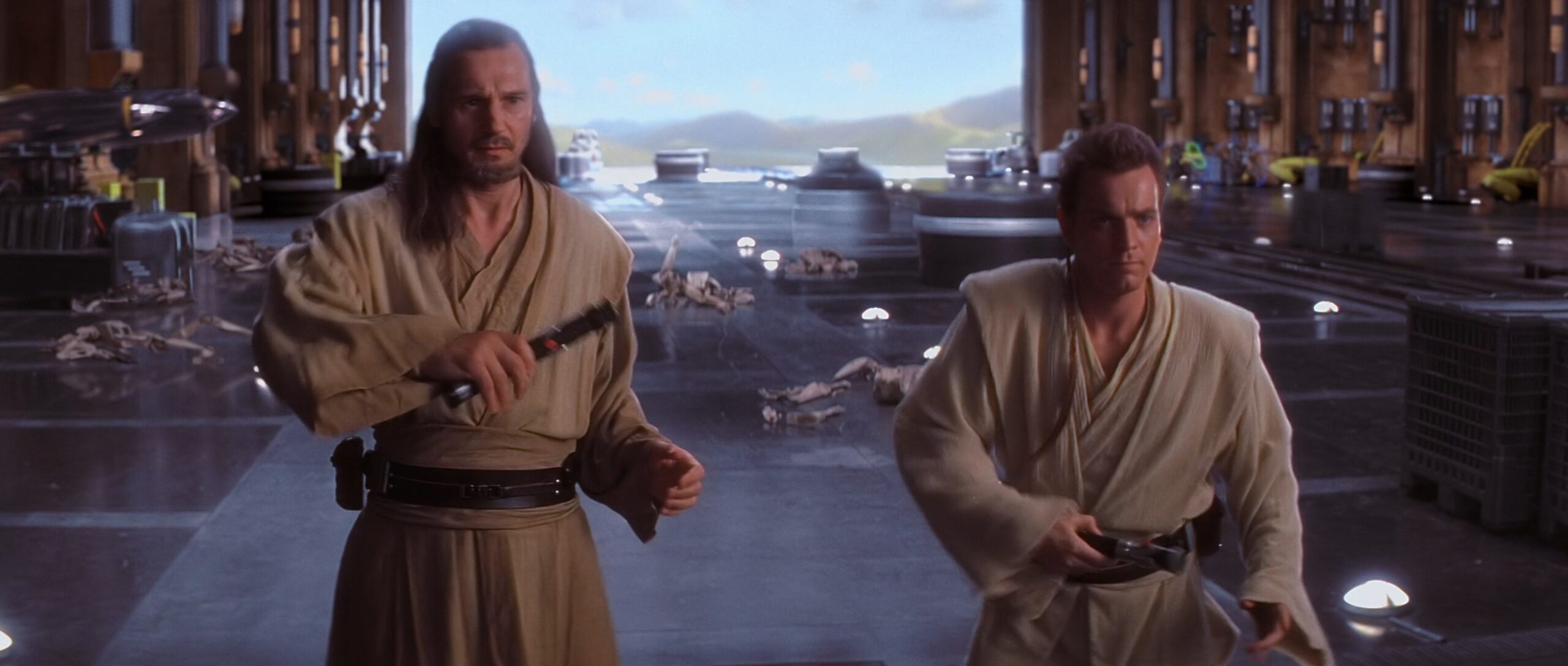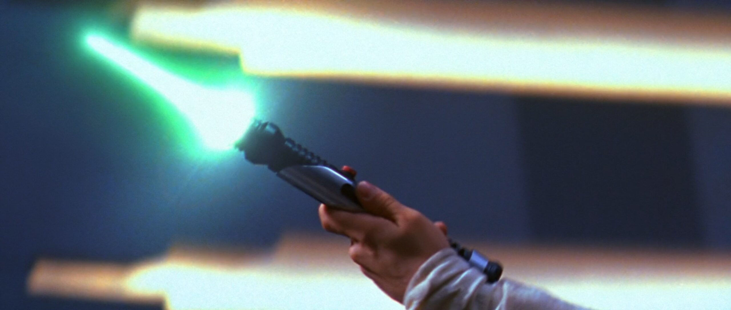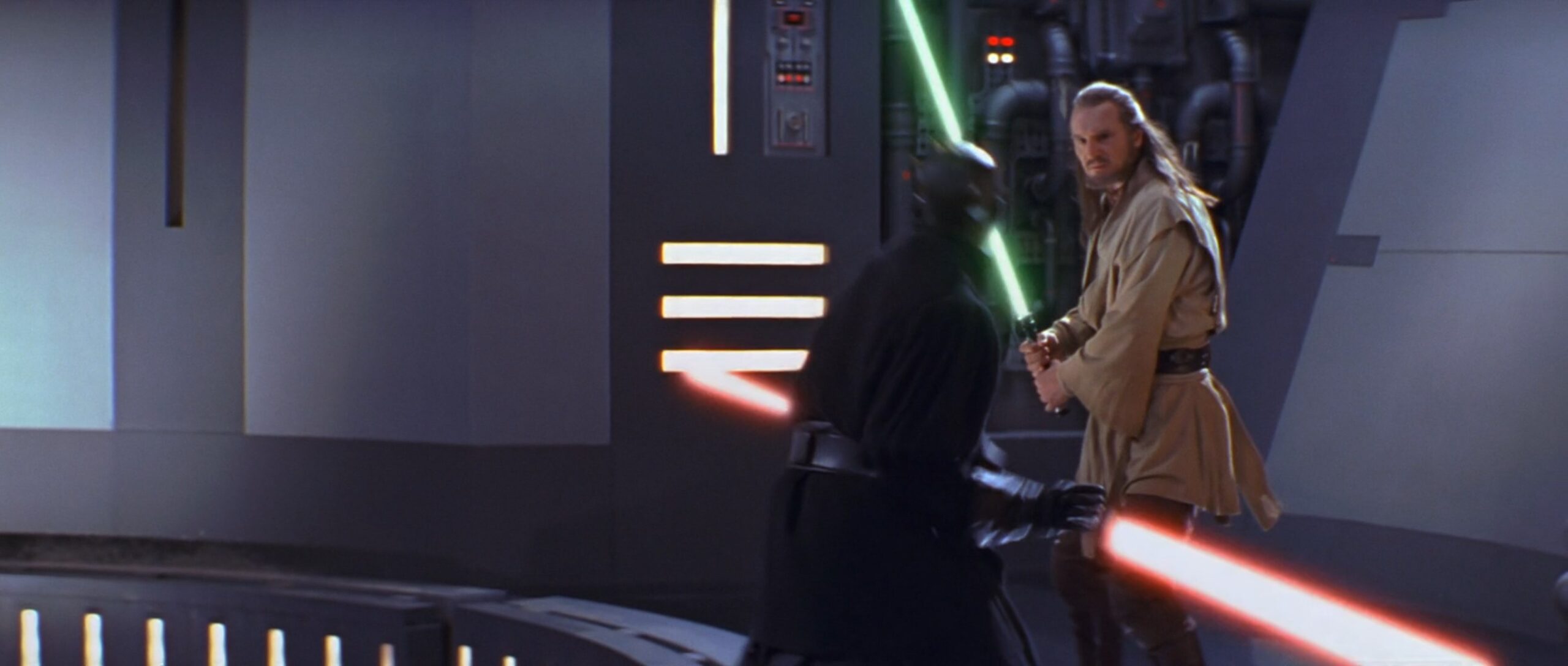 Das Lichtschwert von Qui-Gon Jinn besitzt ein schlichtes, aber elegantes Design mit einem markanten, silbernen Metall-Overlay und schwarzen Griffpartien für besseren Halt. Es begleitete ihn bis zu seinem letzten Duell auf Naboo, wo er im Kampf gegen Darth Maul tödlich verwundet wurde. Danach nutze sein Padawan, Obi-Wan Kenobi es, um den Sith Lord zweizuteilen.