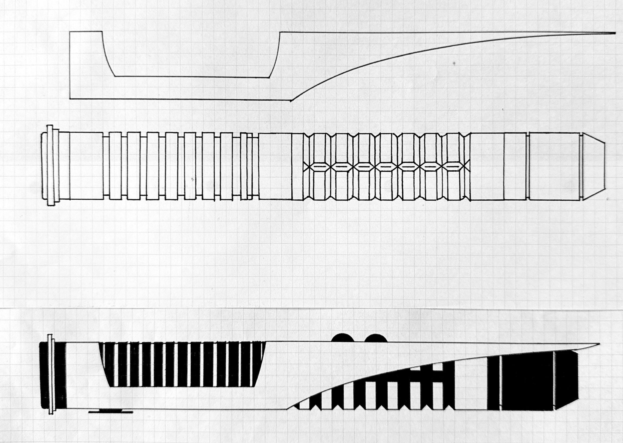 Der Griff basiert auf Standardteilen des The Custom Saber Shop und ist mit einem lasergeschnittenem Overlay customisiert. Durch das Overlay ist der Griffdurchmesser logischerweise dicker als bei einem gewöhnlichen MHS Schwert, was für den großgewachsenen Hannes jedoch kein großes Hindernis darstellt. Es sei jedoch zu erwähnen, dass beim Traxus das Hauptaugenmerk auf die Optik und nicht auf das Handling gelegt wurde.
